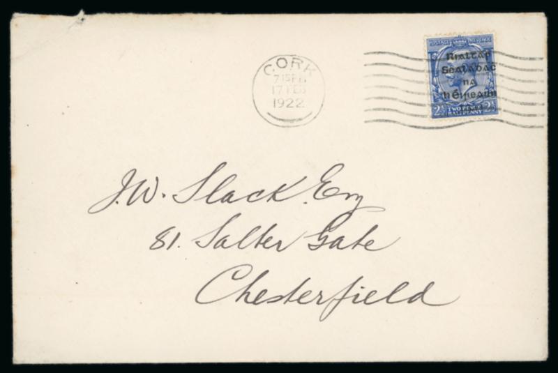 2 1/2d ultramarine and 3d violet, singles, both tied by machine first day cancels CORK/17.FEB.1922, on envelopes sent to Chesterfield, very fine and a scarce pair first-day usages (Image)
