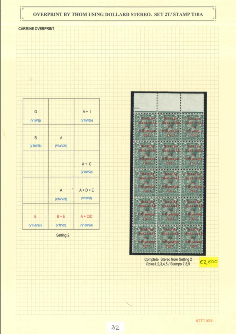4d grey-green, overprint in carmine, mint nh top sheet marginal block of fifteen, showing complete stereo from setting 2, neatly mounted and knowledgably written up on album page, one stamp creased, fresh, very fine, and a very scarce block. Hibernian T10A, €1'650+). (Image)