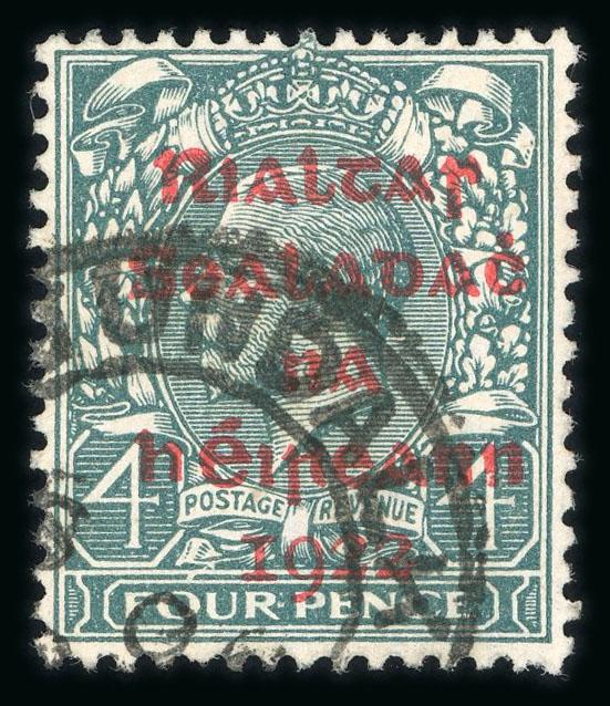 4d grey-green with carmine ovpt, used singles, showing break over FOUR & broken crossbar to 4 varieties, very fine and scarce pair of used errors. Hibernian T10Aa,c; €615. (Image)