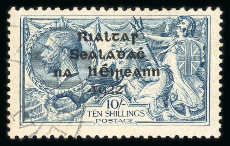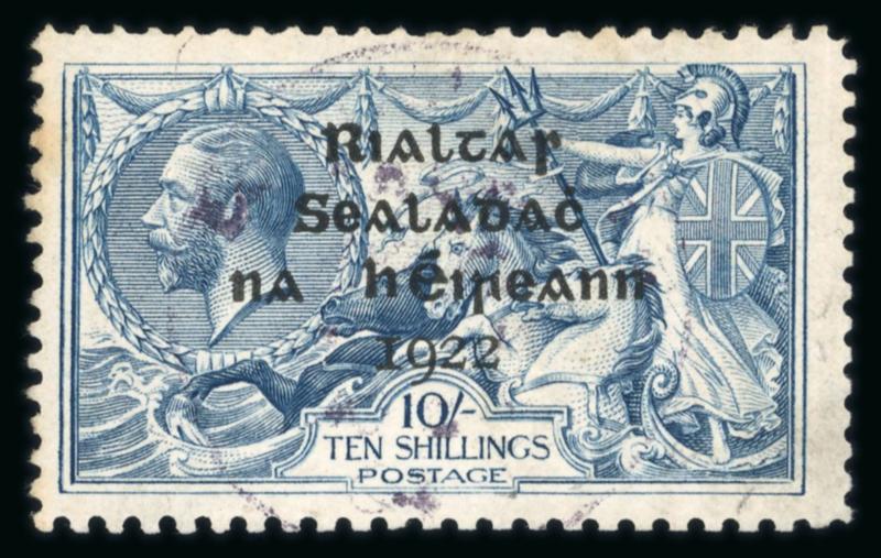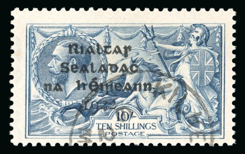 10s dull grey-blue, broken "S" in POSTAGE, used single, with overprint at left and short third line error, fresh, very fine, and a scarce combination of varieties. Hibernian T14ea; €525+. (Image)