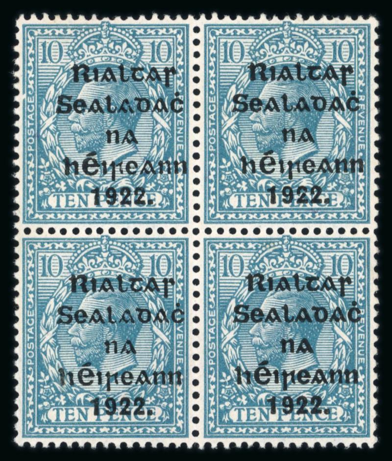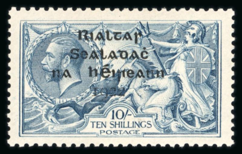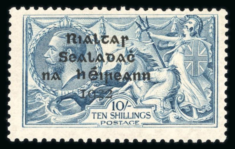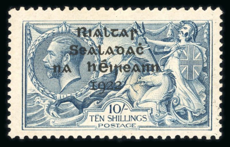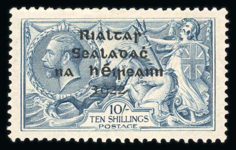 10s grey-blue, mint single, with broken "S" in POSTAGE, showing a major overprint shift to the left and short third line varieties, fresh, very fine, and scarce. Hibernian T14e; €450+. (Image)