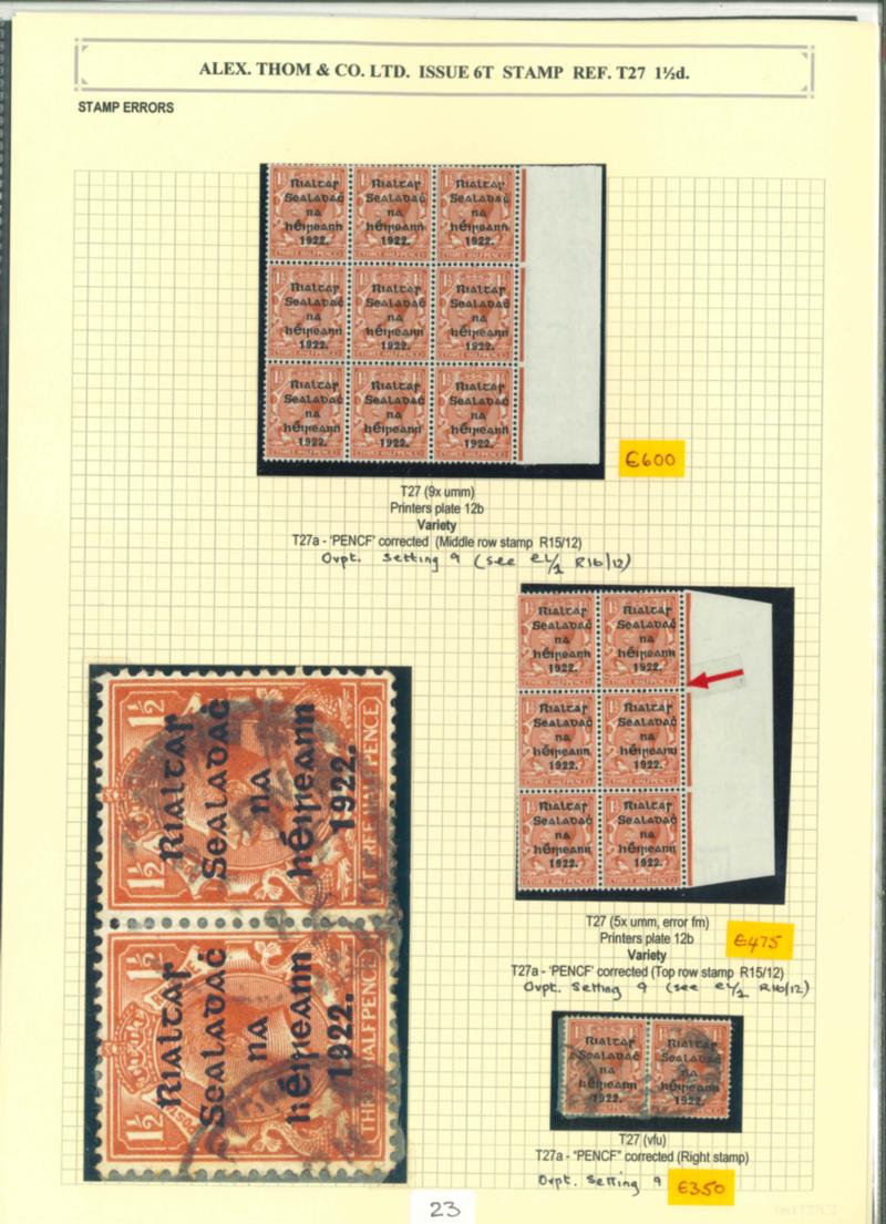10s dull grey-blue, broken "S" in POSTAGE, mint single, with overprint at left error, fresh, very fine, and scarce. Hibernian T14e; €450. (Image)