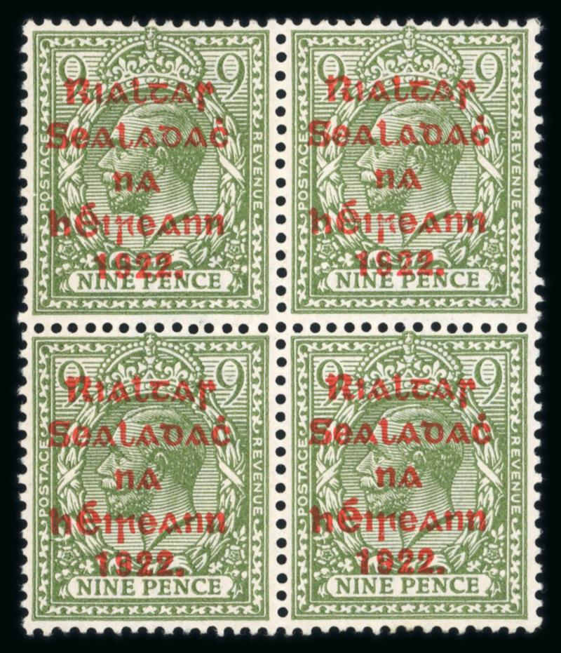 9d olive-green, mint and mint nh block of four, showing PQSTAGE plate error in position 3/1, gum creases, fine and scarce (Hib. €525) (Image)
