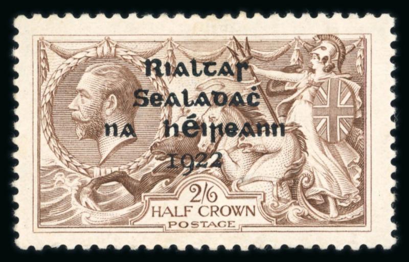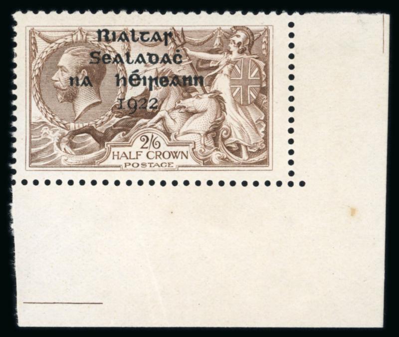 2s6d grey-brown, with perfect "R" in Crown, mint bottom right corner sheets marginal single, with "R" over "SE" variety, light gum bends, fresh and very fine. Hibernian T39.. (Image)