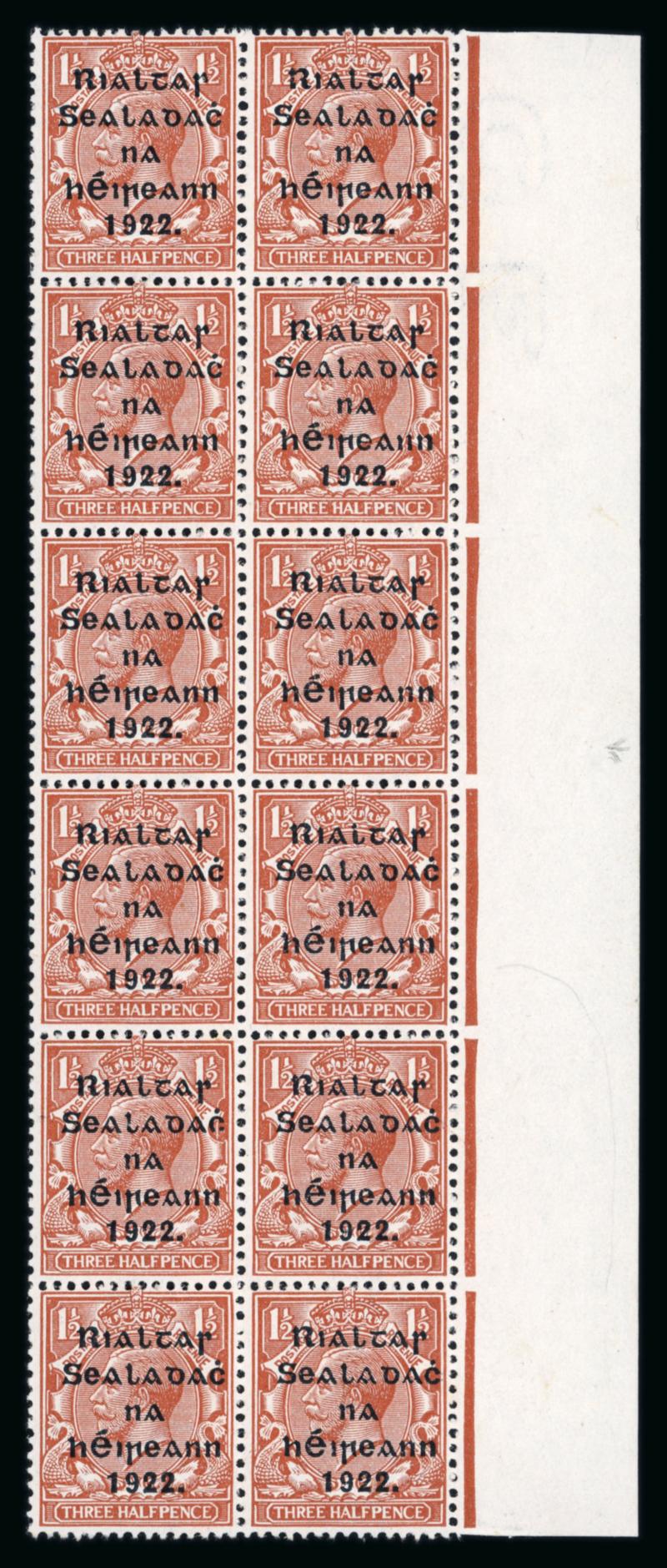 1 1/2d red-brown, mint nh right sheet marginal block of six , one showing PENCF corrected variety (R15/12), additional broken 's' in Rialtas (R17/12), fresh, very fine and scarce (Hib.€450+), ex. Pednault (Image)
