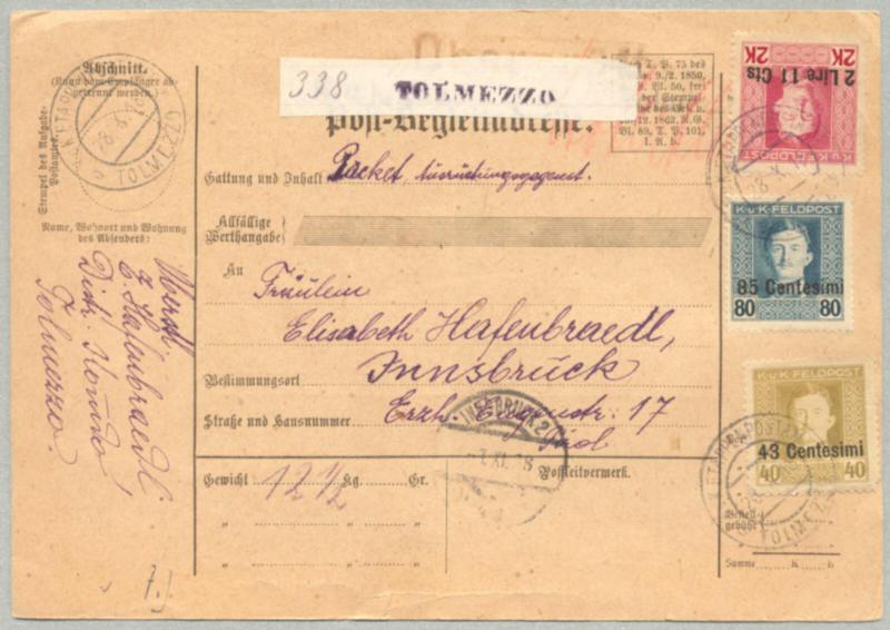 1918, 43C+85C+2L 11C, Italian surcharge on Austrian field post stamps on Post Begleitadresse - packet card with left side coupon from TOLMEZZO to INNSBRUCK, cancelled KK ETAPPENPOSTAMT TOLMEZZO, Überprüft censorship chop at top, fresh and desirable, XF! Schätzpreis 600€. (Image)
