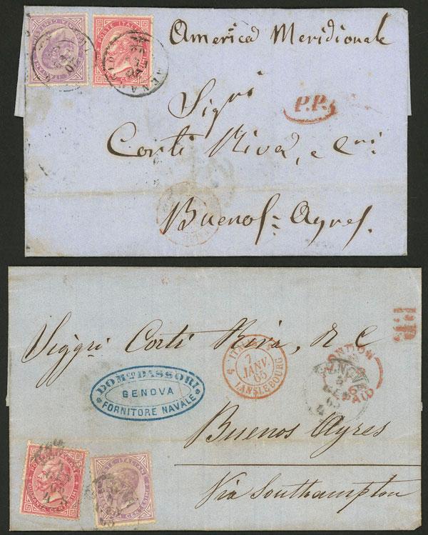 4/JA + 20/FE/1865, couple of folded covers sent from Genova and Menaggio to Argentina, both franked with 1L. (Sc.31 + 32 printed by De La rue), very fine quality! (Image)