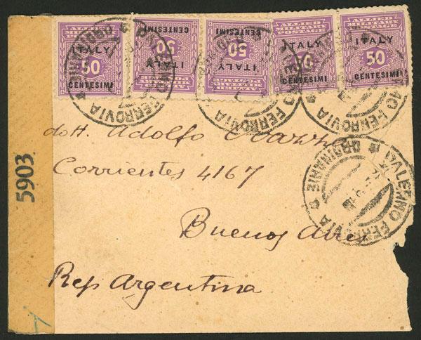 Cover sent from Palermo to Argentina in 1944, franked with stamps of Allied Occupation (50c. x5, total 2.50L.), with censor label, and on back arrival mark of Buenos Aires 19/AU, ex-Loeb (its price was US$250) (Image)
