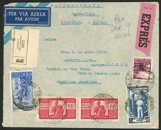 Registered and express airmail cover sent from Genova to Argentina on 2/DE/1950 with spectacular franking of 735L. that combines stamps from 3 different issues, on back there is a transit mark of Roma 3/DE, small defect of little importance (a small part of the back flap is missing), fantastic! (Image)