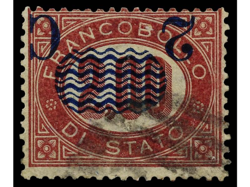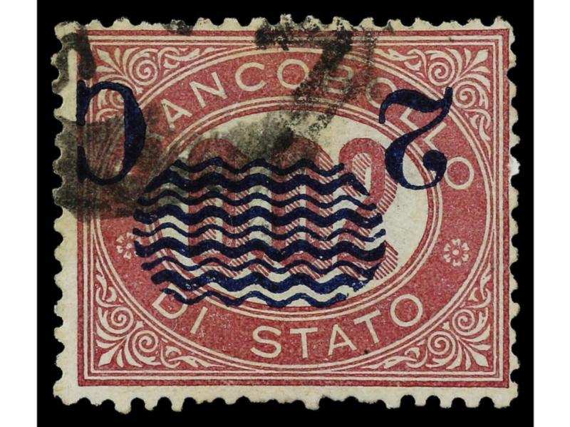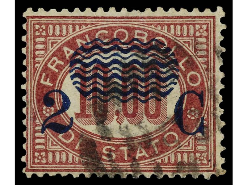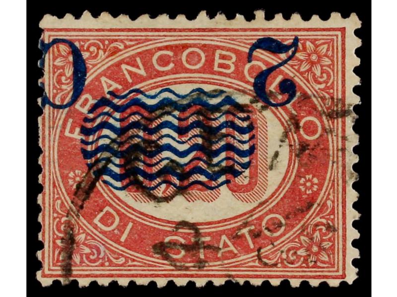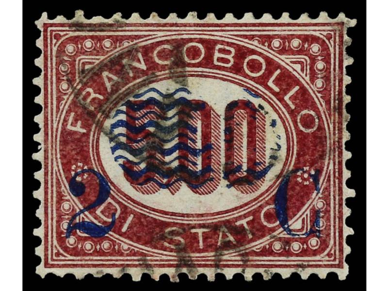 ITALIA. 1878. 2 c. s. 5,00 carmín. Variedad SOBRECARGA DESPLAZADA HACIA ARRIBA y A LA IZQUIERDA. Pequeño corte en parte superior. Cert. H. AVI. Sa.35e. (Image1)