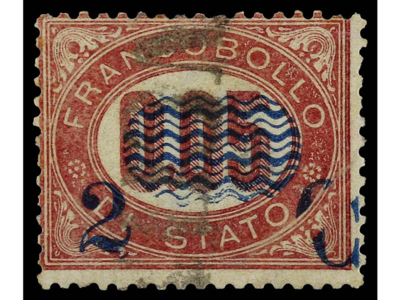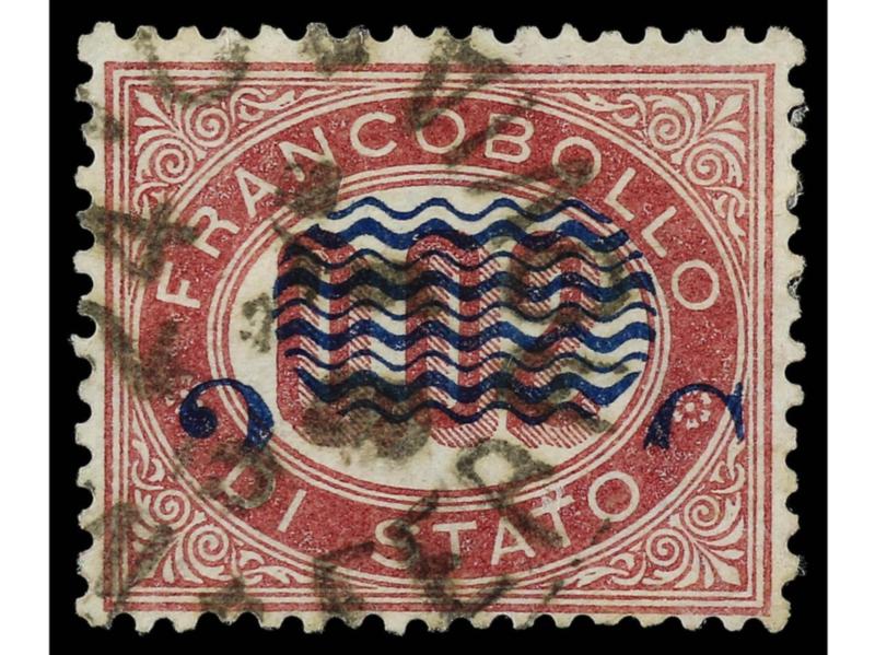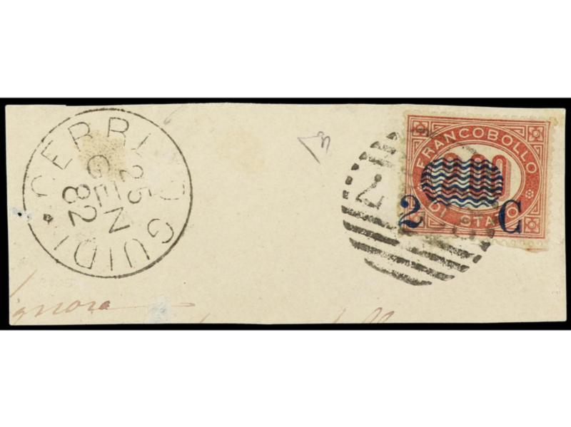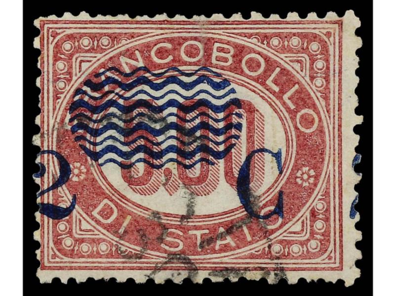ITALIA. 1878. 2 c. s. 5,00 carmín. Variedad SOBRECARGA DESPLAZADA HACIA ARRIBA y SERPENTINA PARCIALMENTE OMITIDA. Firmado. Sa.35dc. (Image1)
