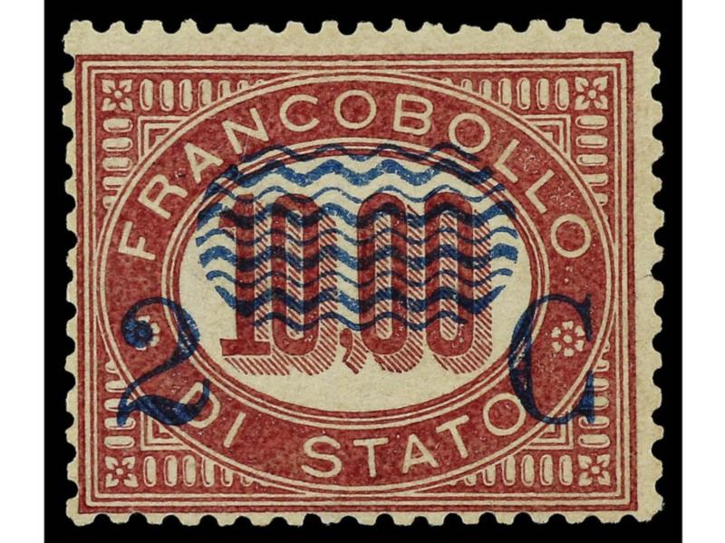 ITALIA. 1878. 2 c. s. 10,00 carmín. Variedad SOBRECARGA DESPLAZADA HACIA ARRIBA. RARO. Cert. DIENA. Sa.36dc. Cat. 4.000€. (Image1)