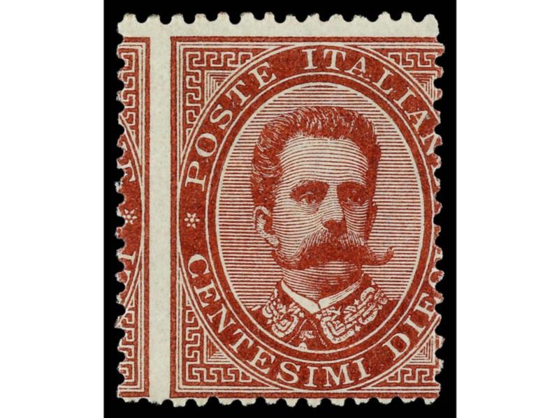 ITALIA. 1879. 10 c. carmín. Variedad DENTADO VERTICAL DESPLAZADO. RARO. Según Sassone solo un ejemplar conocido. Cert. DIENA (fotocopia). Sa.38h. Cat. 6.000€. (Image1)