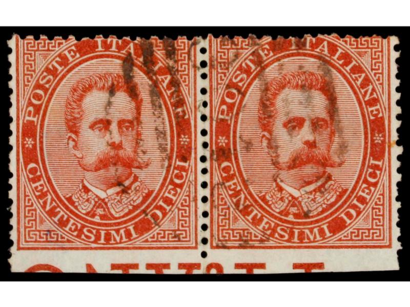 ITALIA. 1879. 10 cts. carmín. Pareja SIN DENTAR MARGEN INFERIOR. Cert. E. DIENA y FIECCHI. Sa.38f. (Image1)