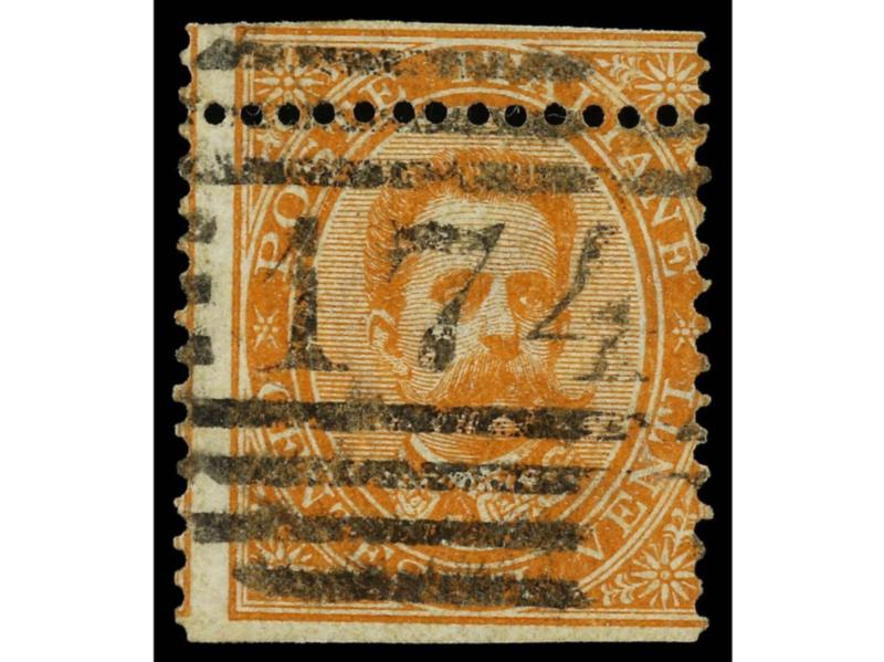 ITALIA. 1878. RONCIGLIONE a CIVITAVECCCHIA. 20 cts. naranja, borde de hoja con parte del número de plancha 44 en un círculo. MUY RARO. Sa.28. (Image1)