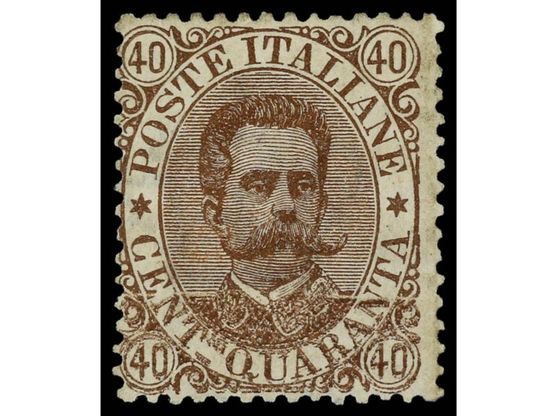 ITALIA. 1889. 40 c. castaño. Variedad DOBLE IMPRESIÓN DE LA PARTE INFERIOR. MUY RARO. Cert. DIENA. Sa.45c. Cat. 16.000€. (Image1)