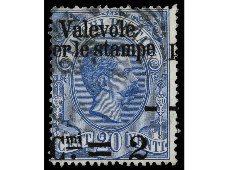 ITALIA. 20 cts. azul SIN EFIGIE EN EL CENTRO, margen inferior cortado. EXCEPCIONAL, único ejemplar conocido. Cert. SORANI. Sa.2r. (Image1)