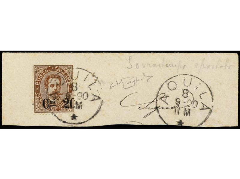 ITALIA. 1890-91. 20 c. s. 30 c. castaño. Variedad SOBRECARGA DESPLAZADA HORIZONTALMENTE. Firmado RAYBAUDI. Sa.57e. Cat. 1.250€. (Image1)