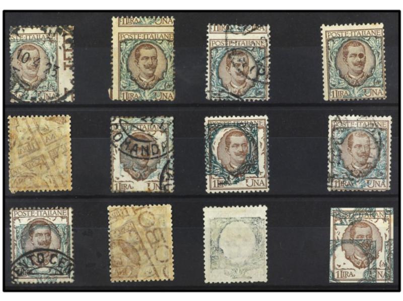 ITALIA. 1901. 1 l. castaño y verde. 12 ejemplares con distintas VARIEDADES DE DENTADO E IMPRESIÓN. Sa.77 (12). (Image1)