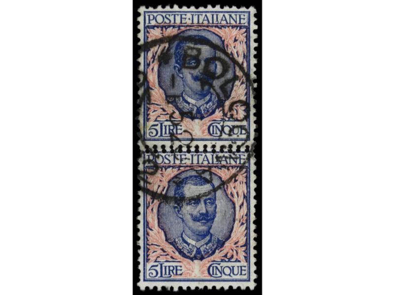 ITALIA. 1891-96. 5 l. carmín y azul. Pareja vertical, un sello variedad DOBLE DENTADO EN EL CENTRO. RARO. Sa.78p. Cat. 600€. (Image1)