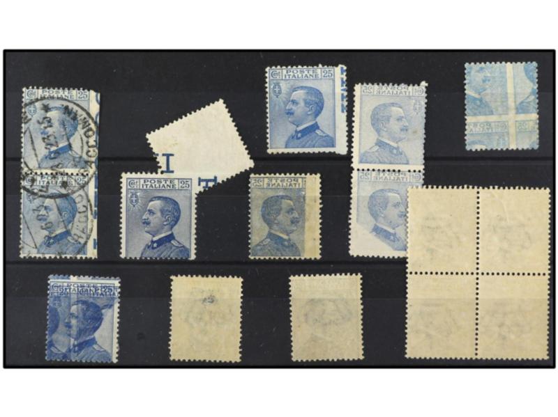 ITALIA. 1908. 25 c. azul. 20 ejemplares con distintas VARIEDADES DE DENTADO E IMPRESIÓN. Sa.83 (20). (Image1)