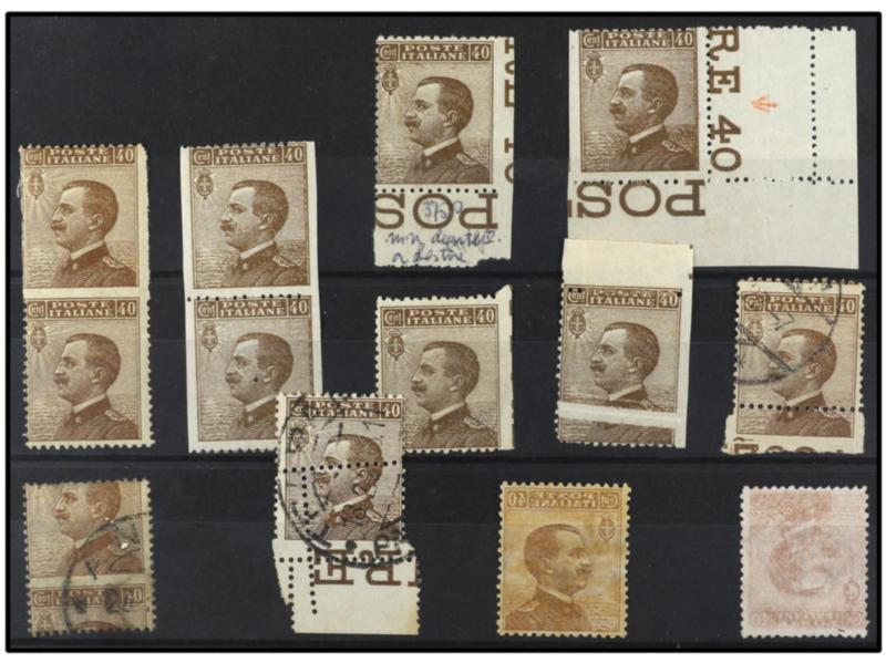 ITALIA. 1908. 40 c. casataño. 11 ejemplares con distintas VARIEDADES DE DENTADO E IMPRESIÓN. Sa.84 (11). (Image1)