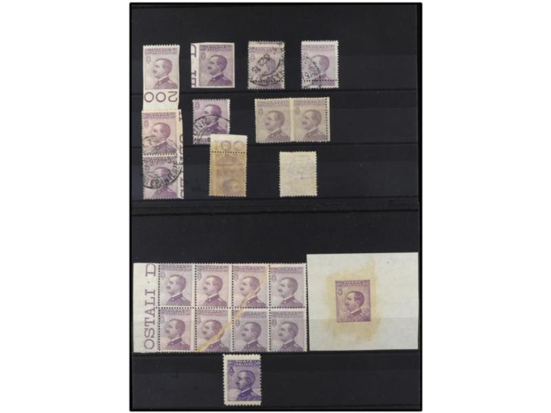 ITALIA. 1908. 50 c. violeta. 12 ejemplares con distintas VARIEDADES DE DENTADO E IMPRESIÓN. Sa.85 (12). (Image1)