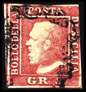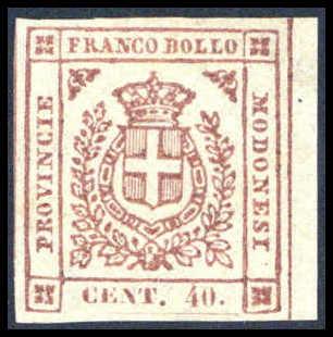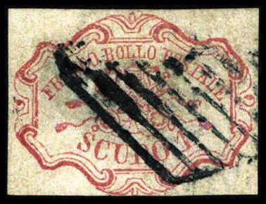 1 Sc. karminrosa, ringsum voll- bis breitrandiges, ungebrauchtes Luxusstück in außergewöhnlich kräftiger, frischer Farbe und mit vollständigem, fast postfrischem Originalgummi. In dieser Qualität eine Altitalien-Seltenheit, Fotoattest Sorani. (Sassone 11 = 7.500,-) Katalogpreis: 3.000,-(Image 1)(Image 2)