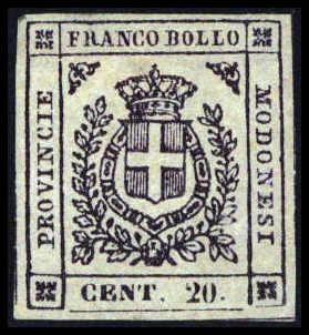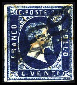 20 C. lebhaftblau (Azzuro Vivo), besonders tieffarbiges und ringsum voll- bis breitrandiges Kabinettstück. Eine seltene Marke, Fotoattest Cardillo (Sassone 2e = 4.500,-). Katalogpreis: (4.500,-)(Image 1)(Image 2)