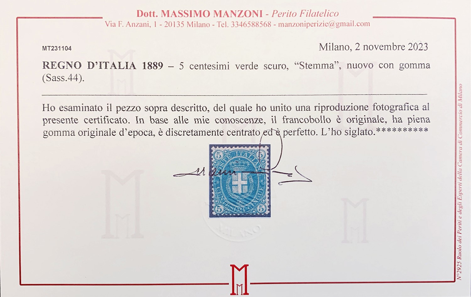 1859 - 5c verde e 15c bruno, su frontespizio completo da "MODENA 11 NOV 59" a Reggio. Firme Giulio Bolaffi e Vaccari, CF Bottacchi (Sassone 12+13 - Euro 50.500:2 = Euro 25.250)