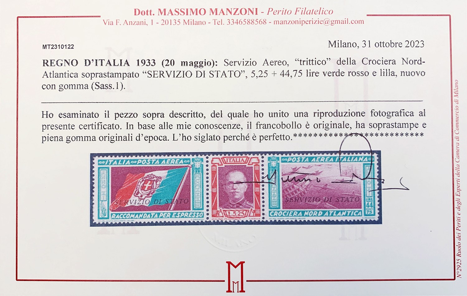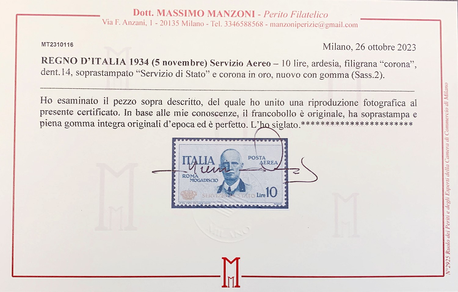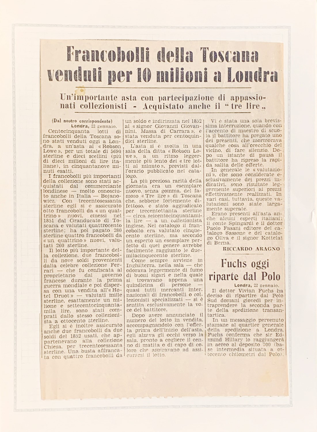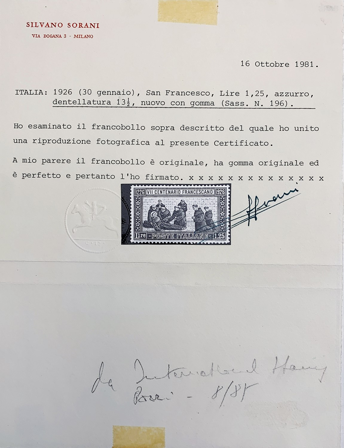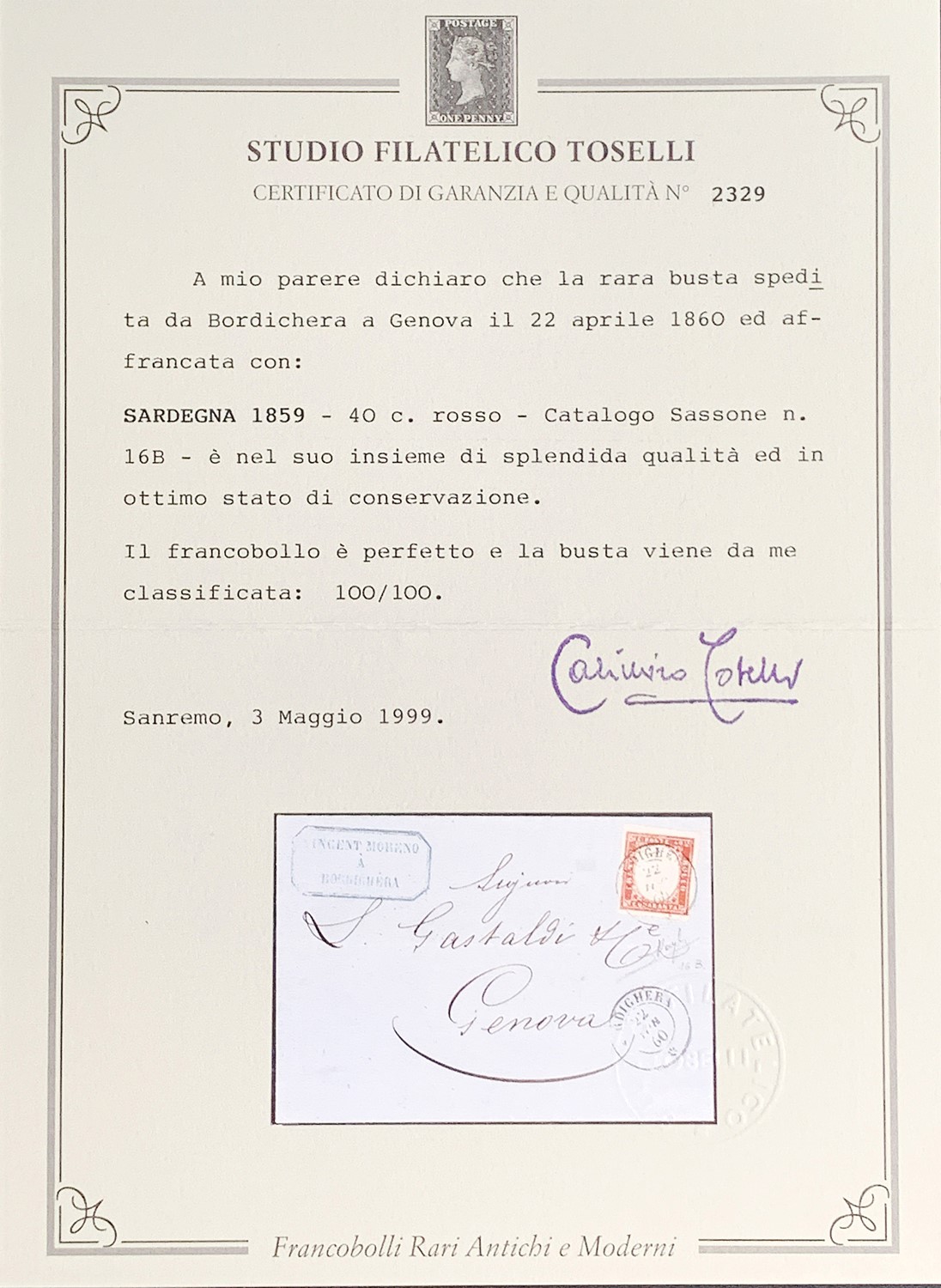1819 - Provvisoria, 25c azzurro su doppio foglio senza piega con filigrana rappresentante lo stemma dei Savoia e un cammeo di Vittorio Emanuele, spedito da Dogliani a Torino il 4 settembre 1819. Questa filigrana molto probabilmente verrà presa come spunto per la rielaborazione di quella dell'emissione definitiva. Molto rari i "Cavallini" dell'emissione provvisoria con questa tipologia di filigrana. Sigla Colla e CF Manzoni (Sassone 2 - Euro 12.000+)