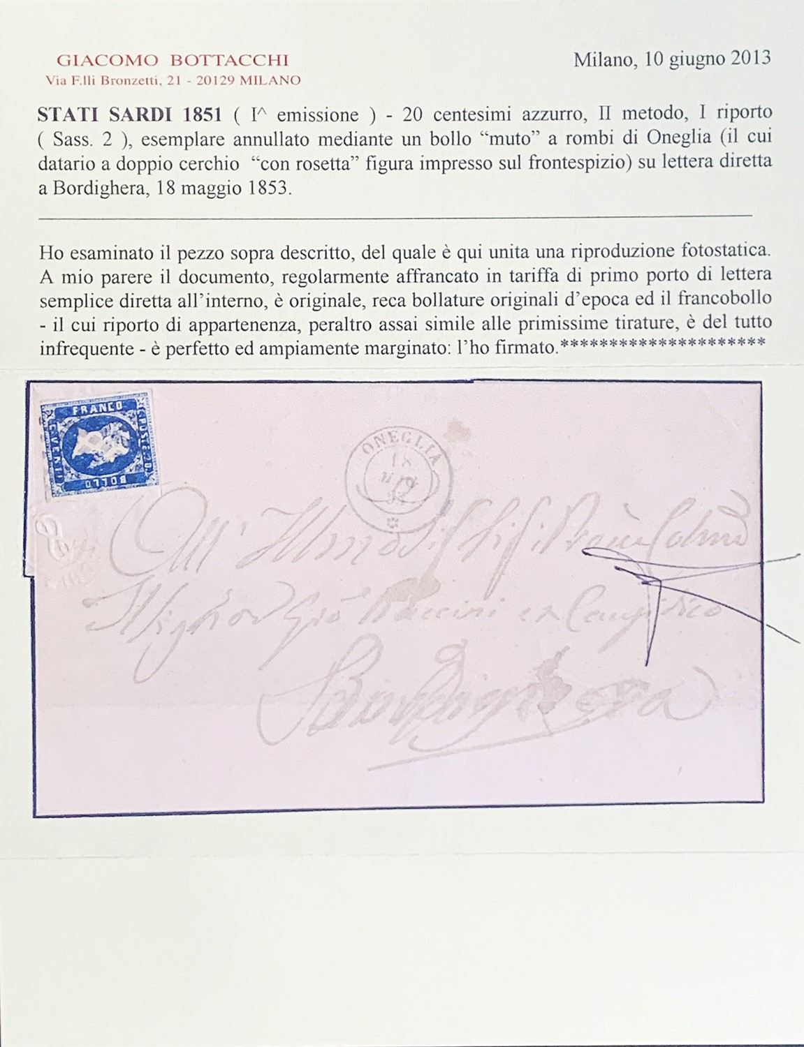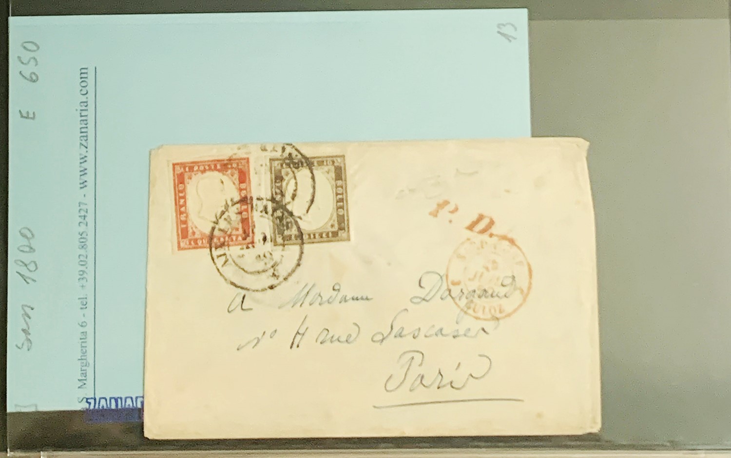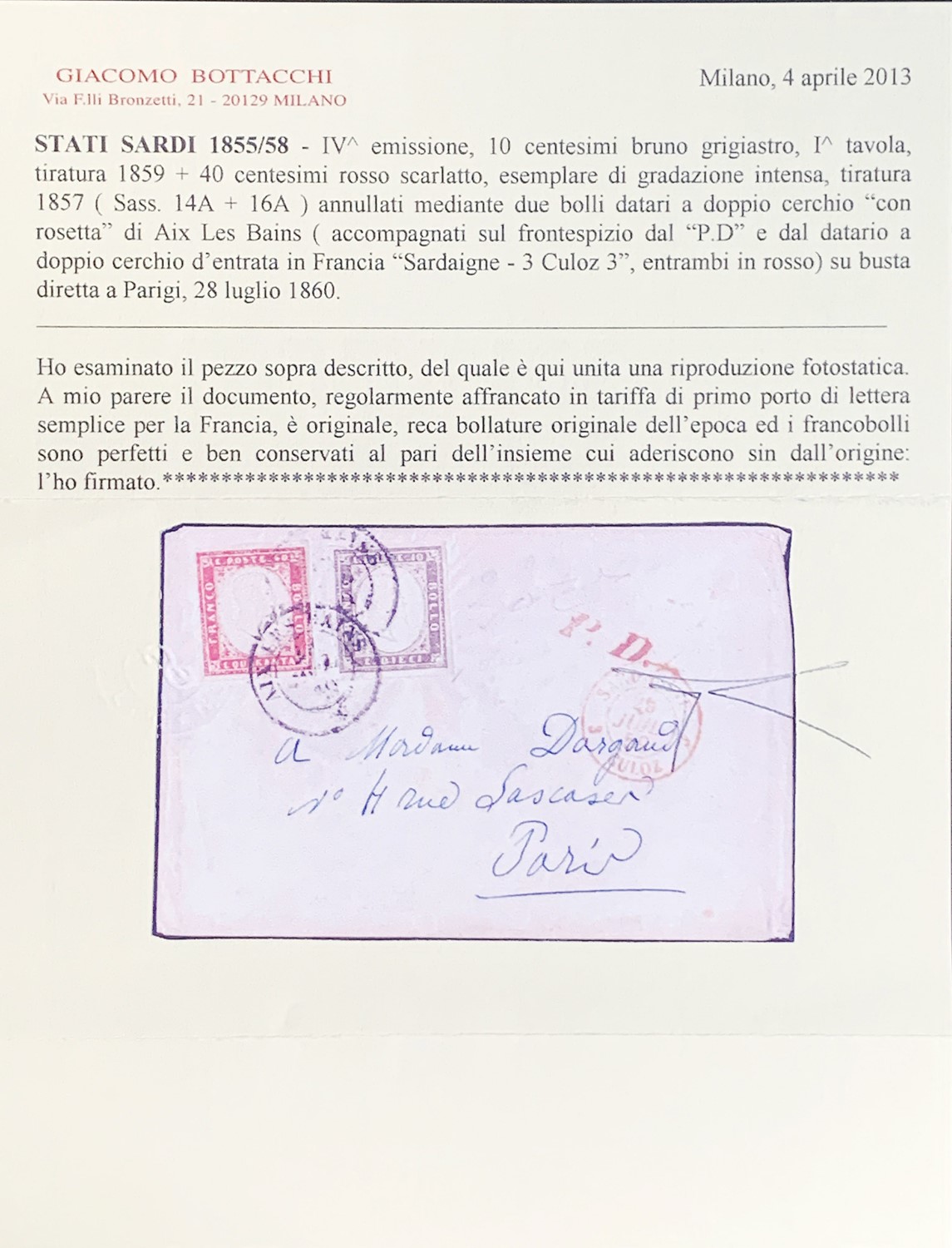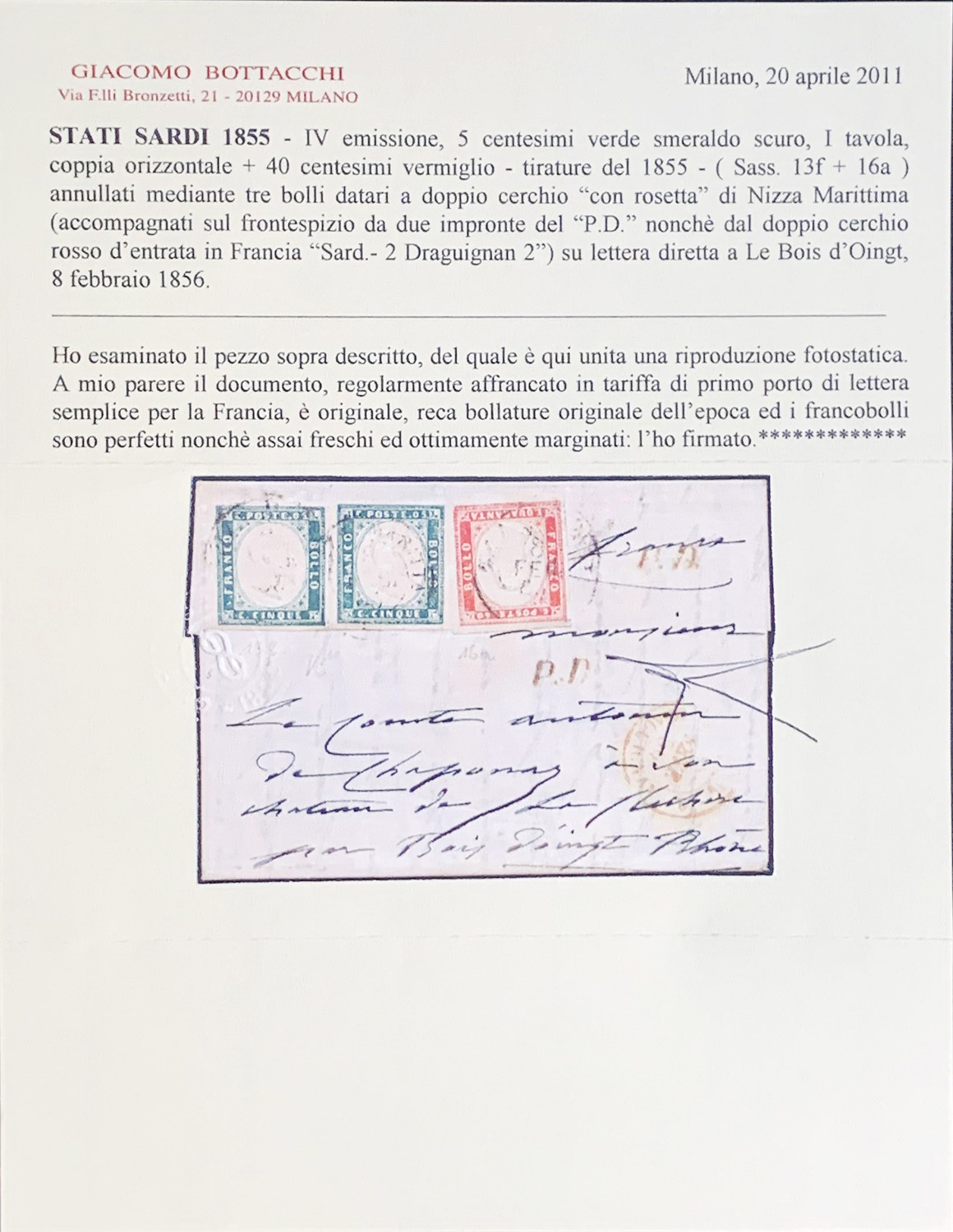 1860 - France 20c blue Napoleon III (Yvert 14), pair applied across a cover with text of March 8, 1853, from Paris to Final-Borgo. The pair, initally not canceled, was struck on arrival with a Sardinian diamond dumb postmark of Final-Borgo. Very likely unique, Cert. Manzoni (Image 1)(Image 2)(Image 3)(Image 4)(Image 5)