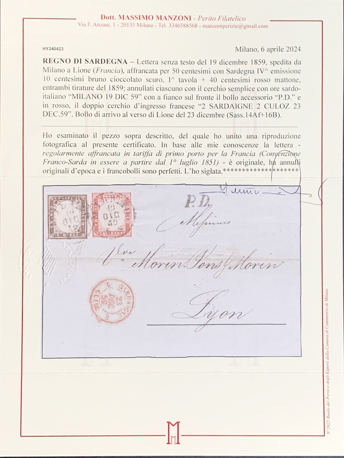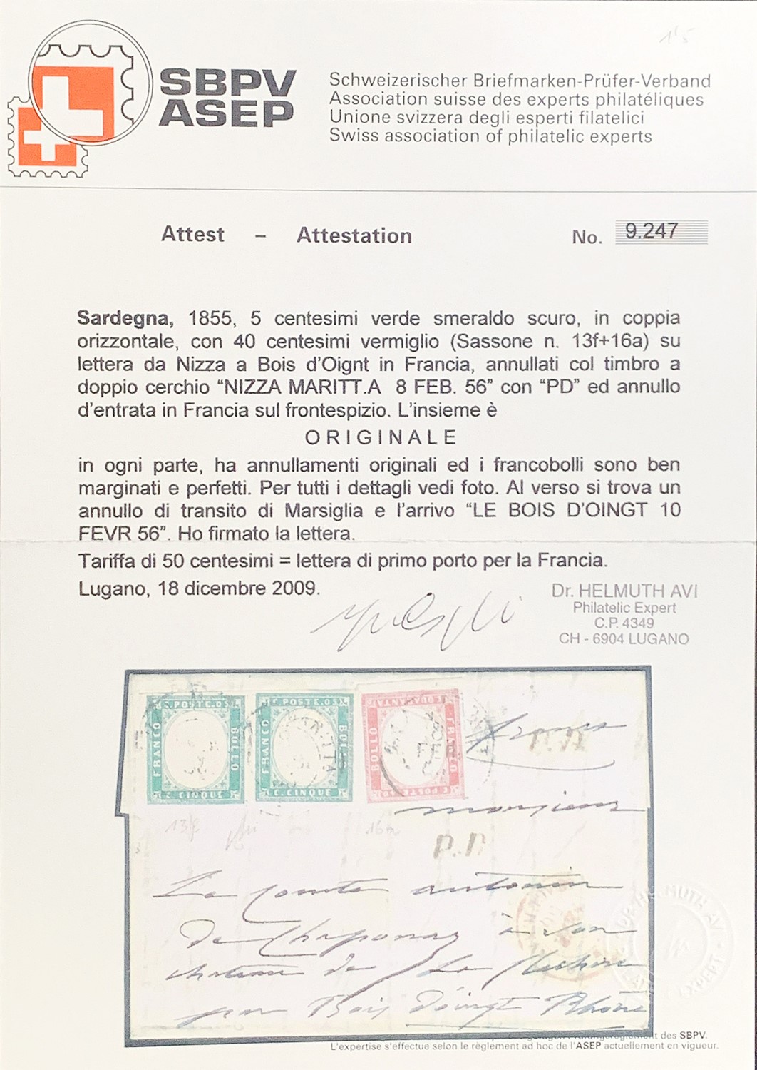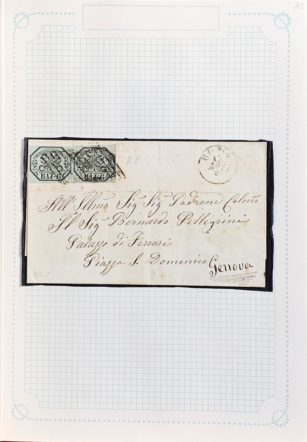 1860 - France 20c blue Napoleon III (Yvert 14), pair applied across a cover with text of March 8, 1853, from Paris to Final-Borgo. The pair, initally not canceled, was struck on arrival with a Sardinian diamond dumb postmark of Final-Borgo. Very likely unique, Cert. Manzoni (Image 1)(Image 2)(Image 3)(Image 4)(Image 5)