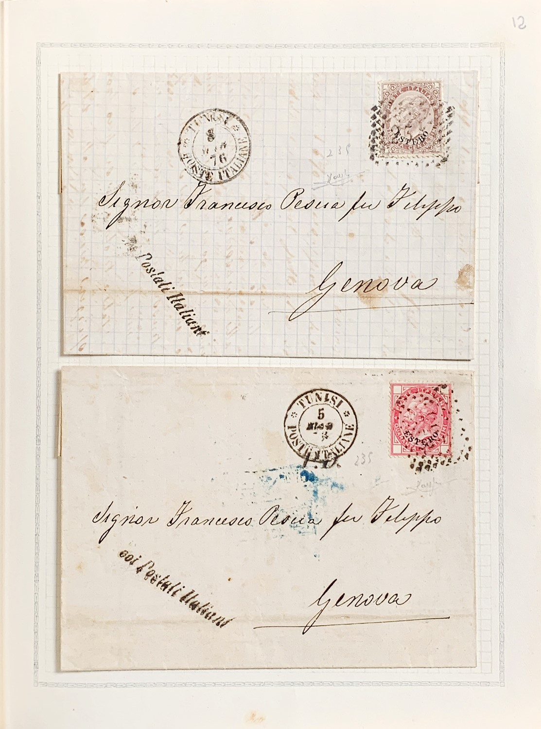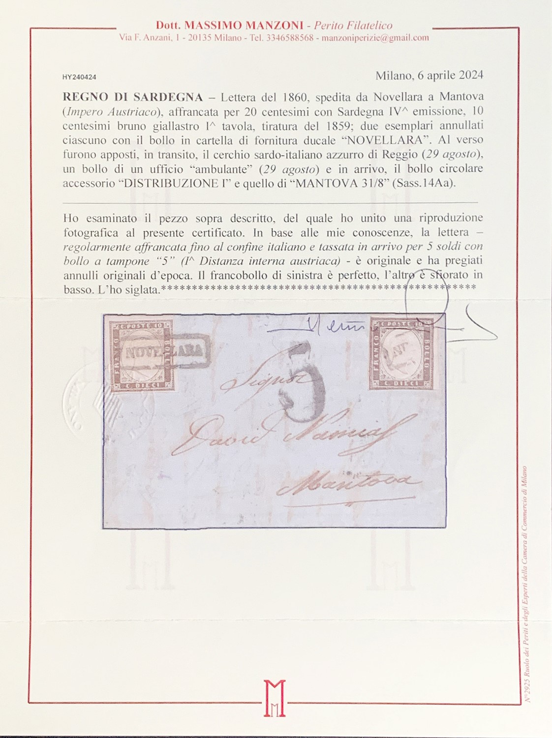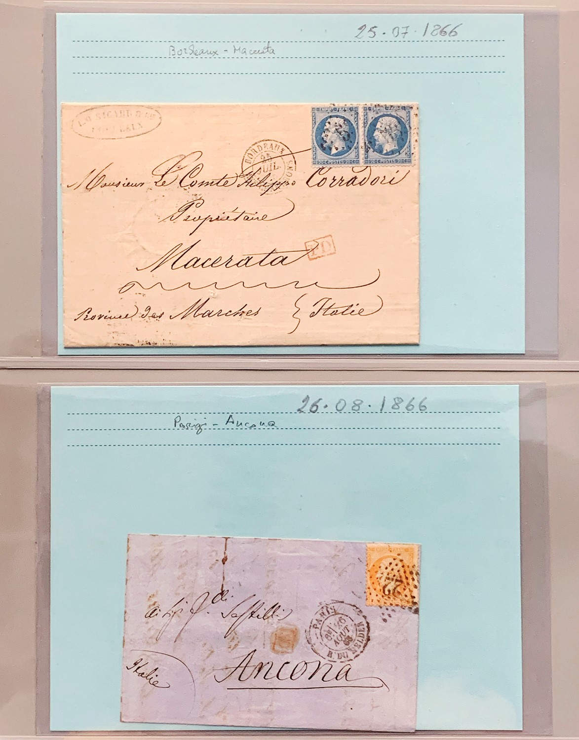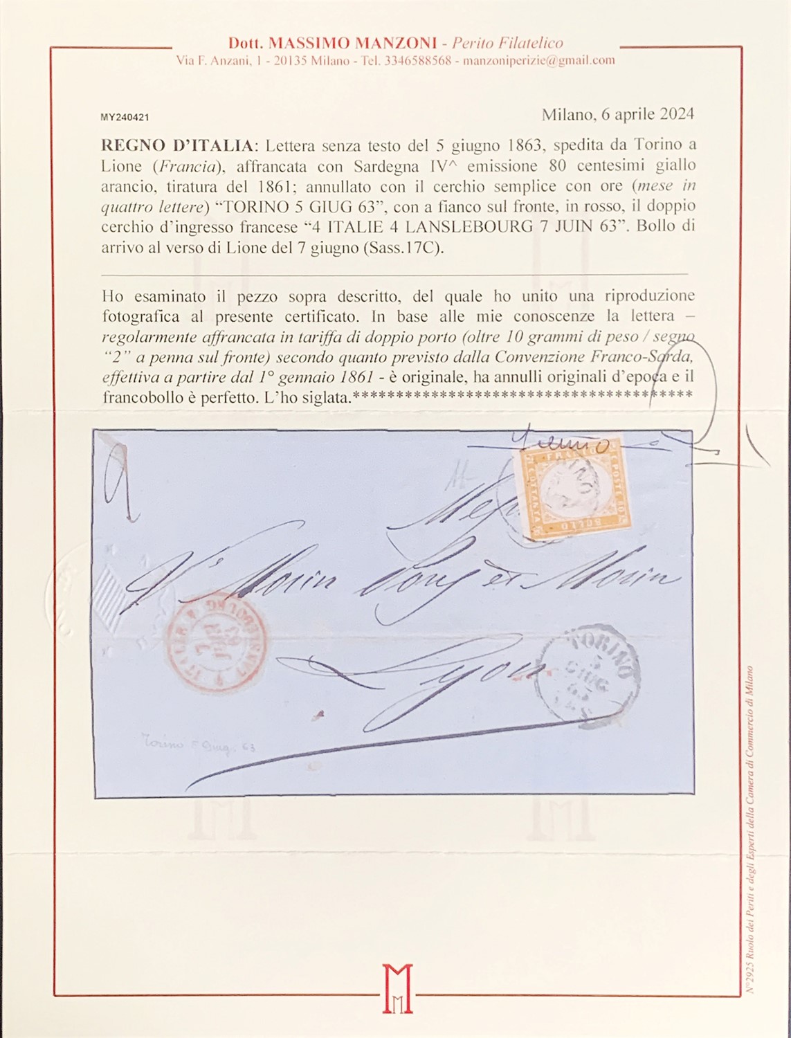 1860 - France 20c blue Napoleon III (Yvert 14), pair applied across a cover with text of March 8, 1853, from Paris to Final-Borgo. The pair, initally not canceled, was struck on arrival with a Sardinian diamond dumb postmark of Final-Borgo. Very likely unique, Cert. Manzoni (Image 1)(Image 2)(Image 3)(Image 4)(Image 5)