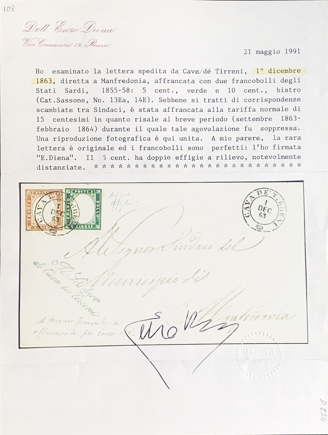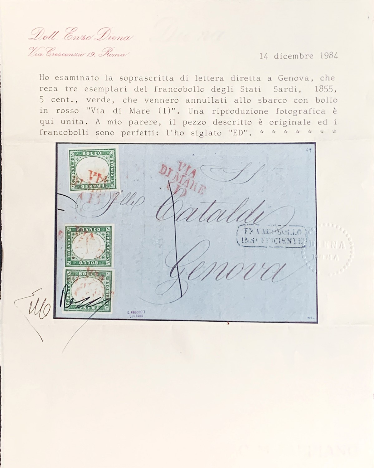 1819 - Provisional, 15c blue on sheet without fold with watermark "coat of arms" and "Vittorio Emanuele I" effigy, from Genova to Sassello on December 16, 1819, during the validity period. Very rare with this watermark. Sign. A.Diena, Guglielmo Oliva and (Image 1)(Image 2)