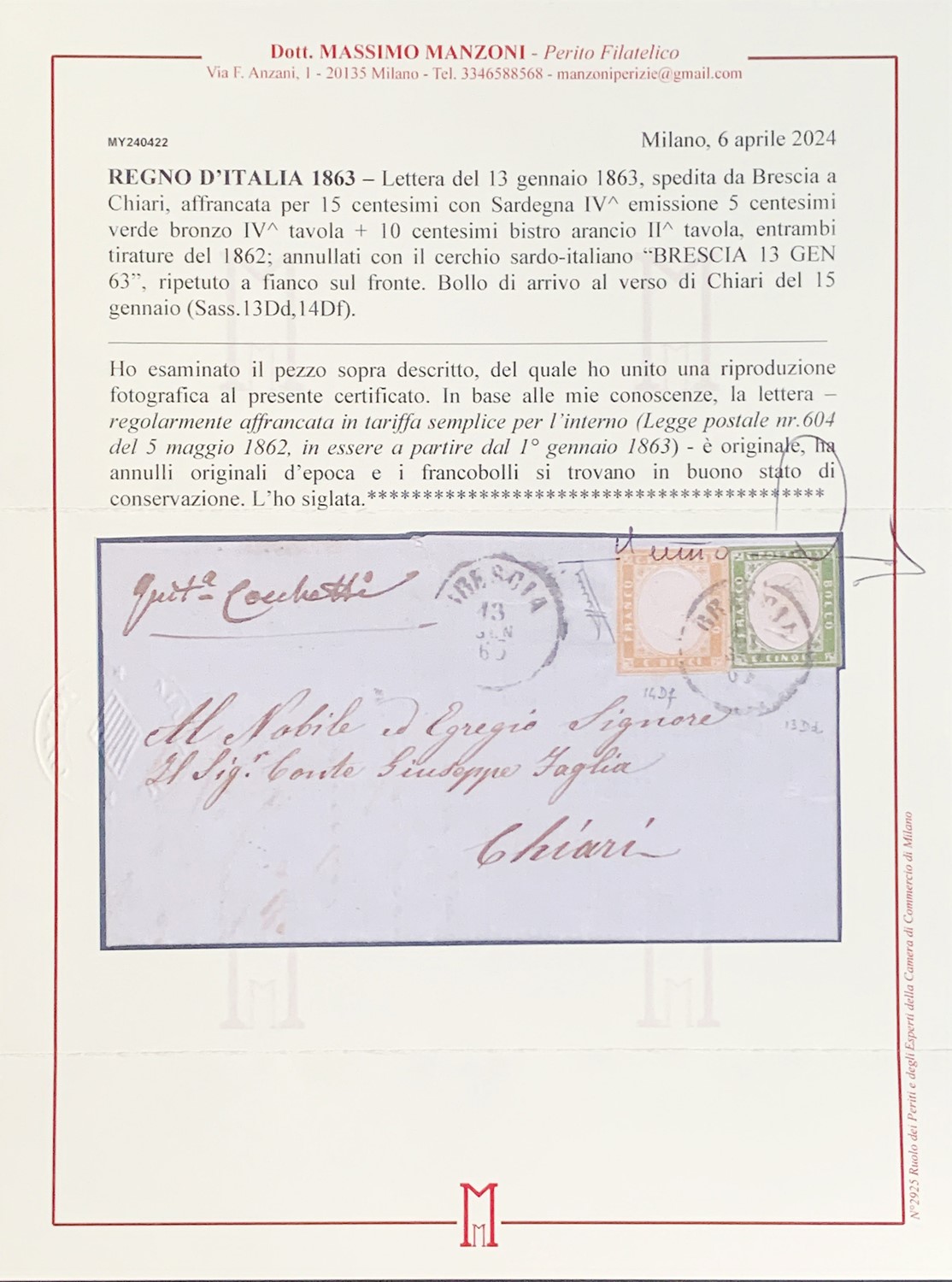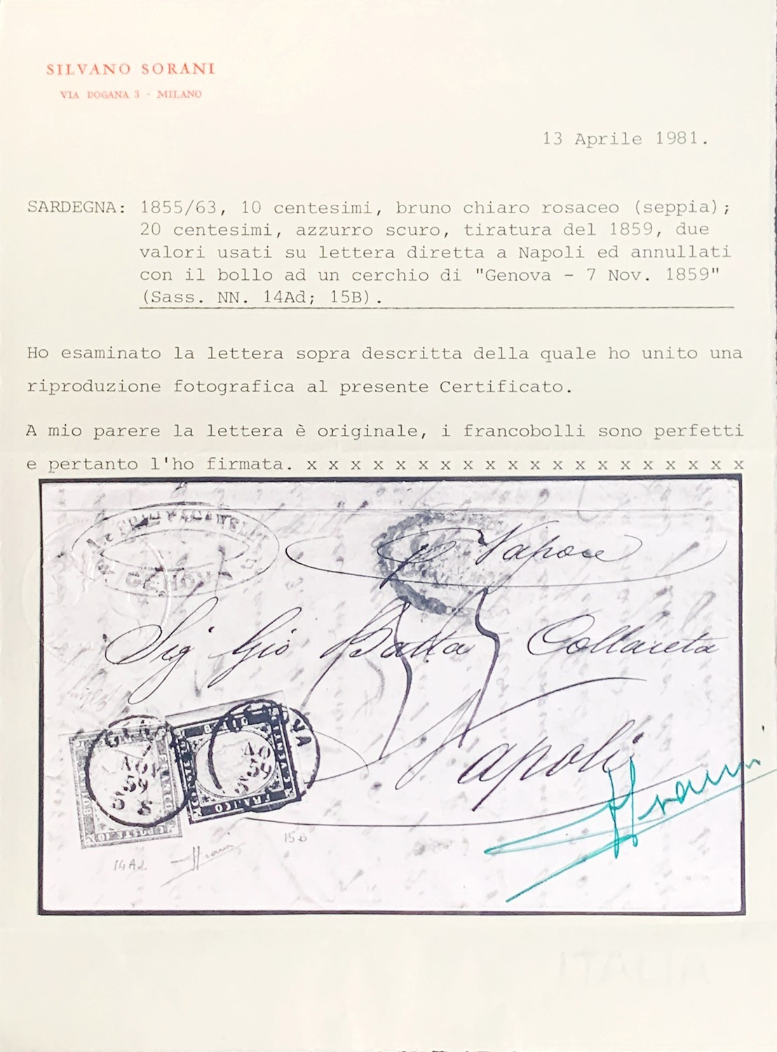 1859 - 5c green and 15c brown, on complete front of letter from "MODENA 11 NOV 59" to Reggio. Sign. Giulio Bolaffi and Vaccari, Cert. Bottacchi (Sassone 12+13 - Euro 50.500:2 = Euro 25.250) (Image 1)(Image 2)(Image 3)