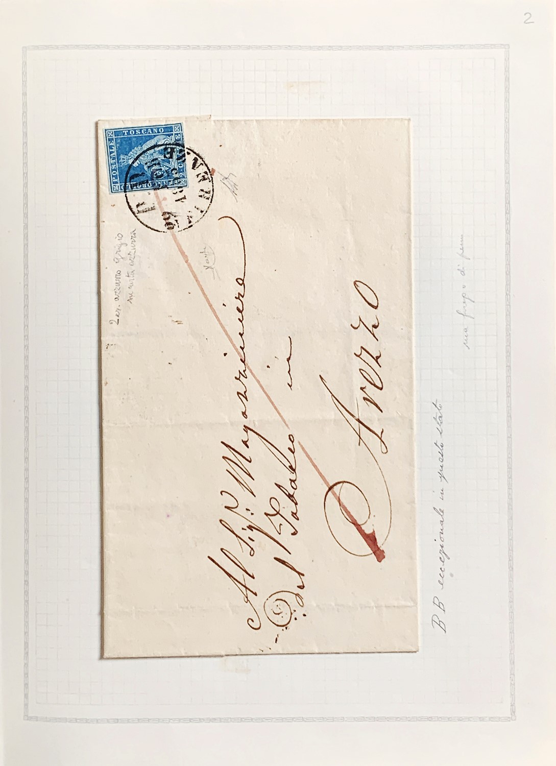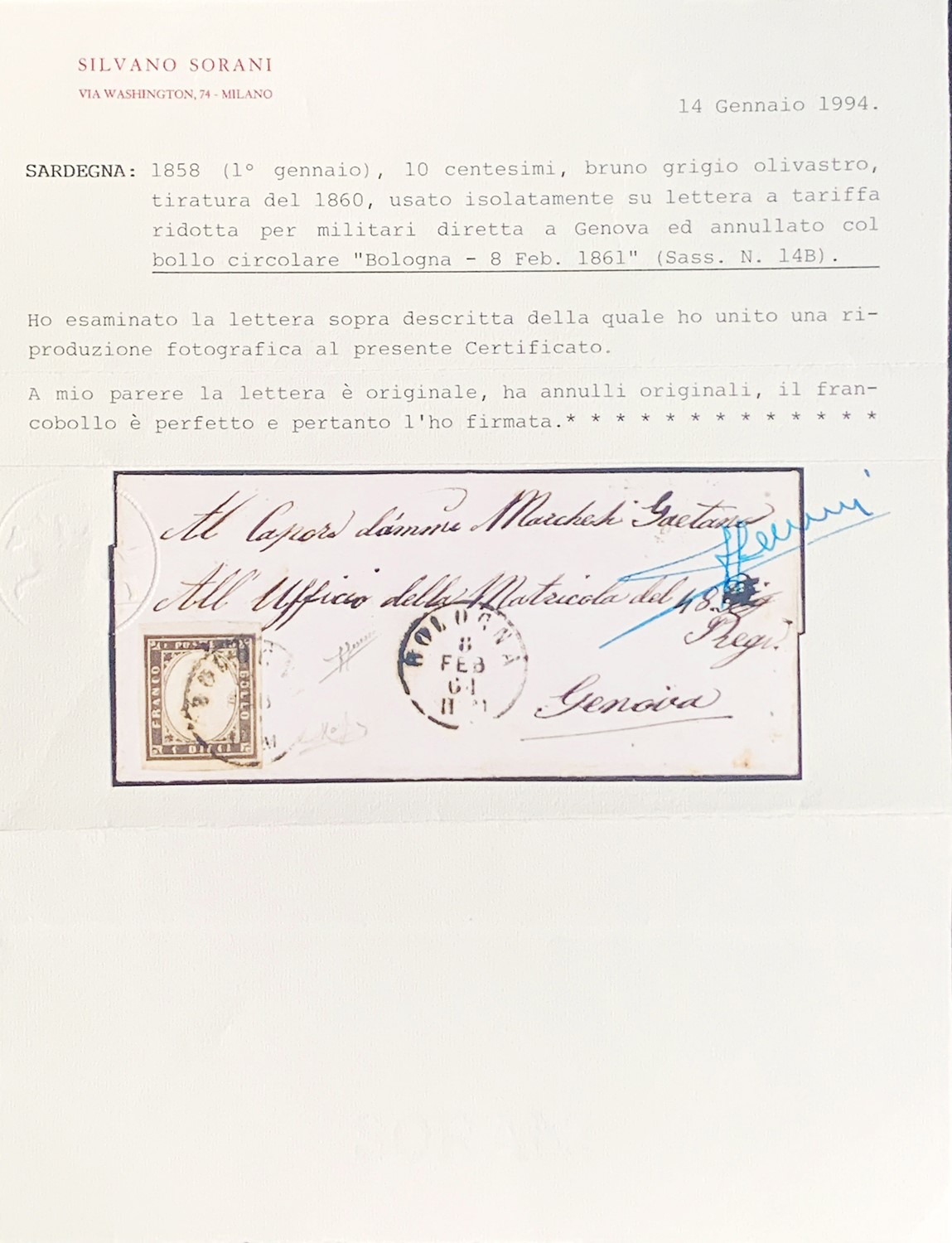 1860 - 20c greyish blue, 1st plate, canceled "R. field post SARDA (N.7) 29 SET 60" from Ancona to Firenze, during the very first days after its liberation. Extremely rare cancel, very well struck. Cert. Bottacchi (Sassone 15Cc+pt.13 - Euro 9.000) (Image 1)(Image 2)(Image 3)