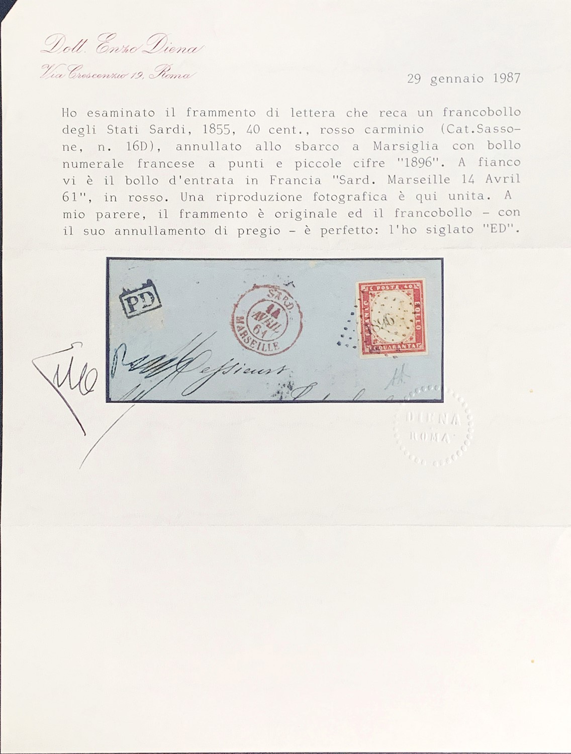 1861- 40c red carmine on letter posted on the ship to Genova on November 2, 61, canceled at disembark in Napoli "ARRIVO A NAPOLI COI POSTALI NAZIONALI" in red. Only one known on a 40c. Sign. Giulio Bolaffi and Cert. E.Diena (Sassone 16D+pt.13 - Euro 9.000+) (Image 1)(Image 2)(Image 3)
