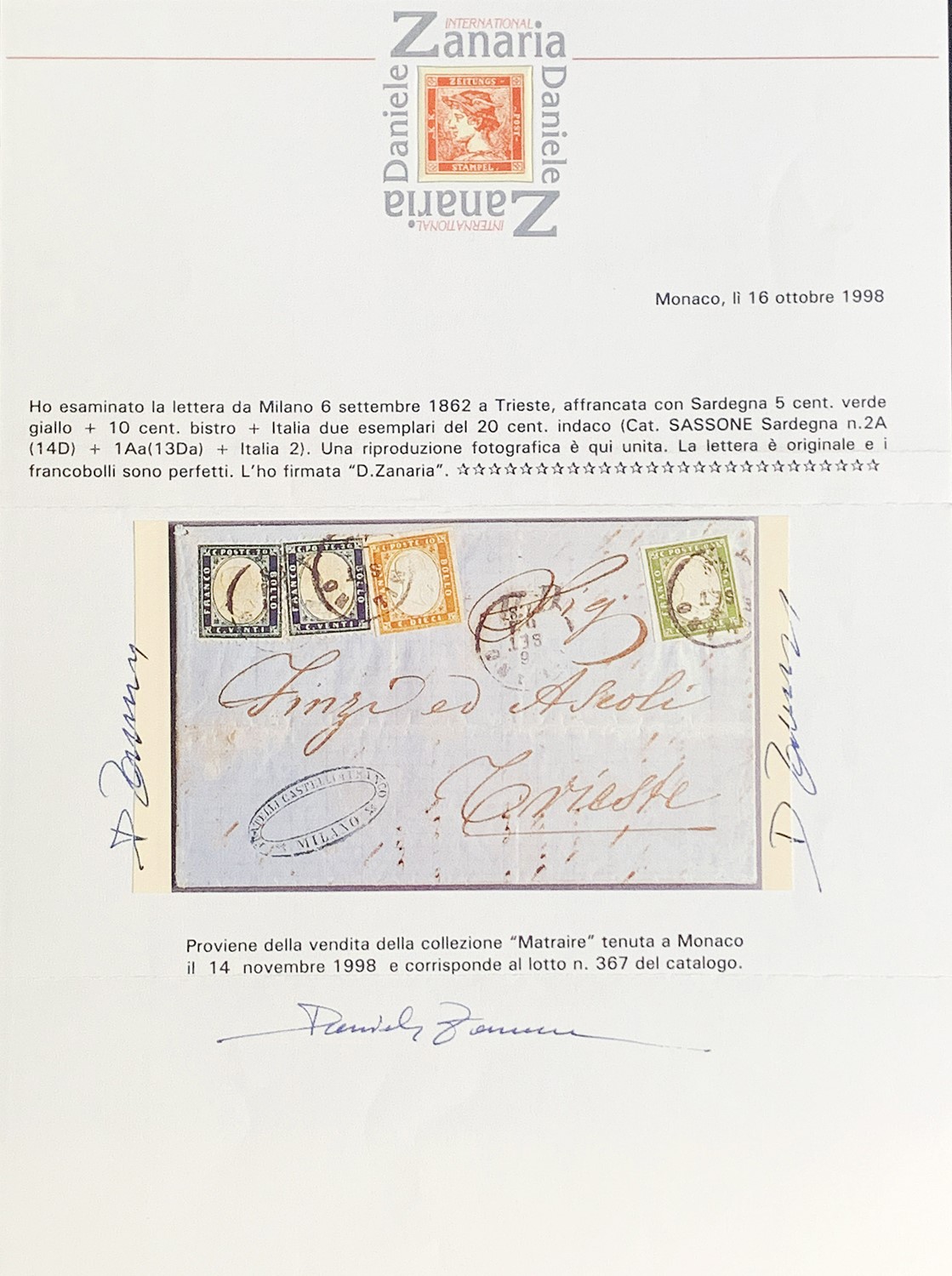 1855 - insieme di tre lettere spedite da "ZOAGLI" tra il 1857 e il 1858 per lo stesso destinatario a Torino, tutte affrancate con un 20c della IV emissione, delle quali una con annullo a penna e leggera piega sul francobollo, le altre due perfette, tutte firmate da Sorani e A.Diena (Sassone 15b+15A+15B+pt.7x2+pt.10 - Euro oltre 4.800)