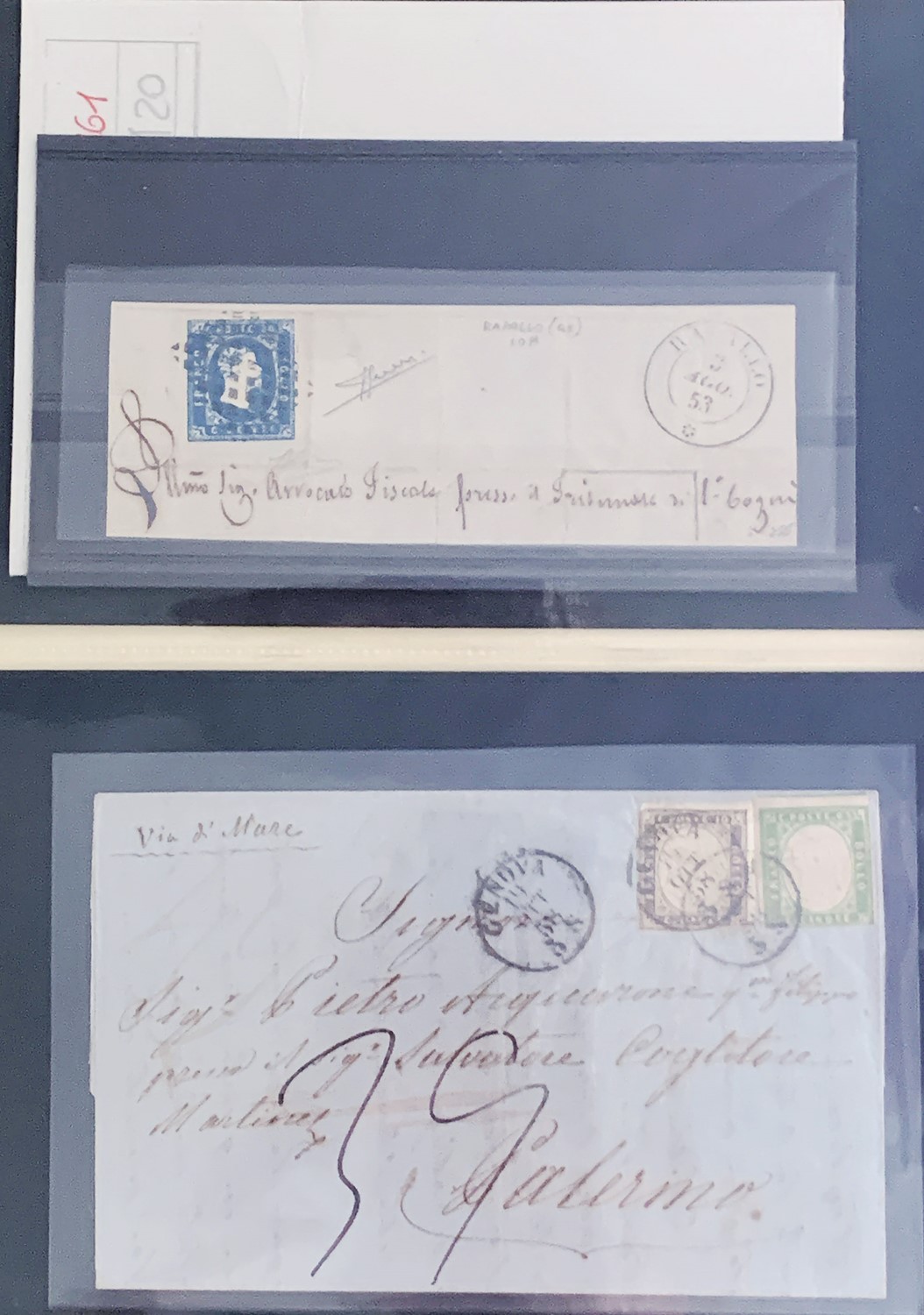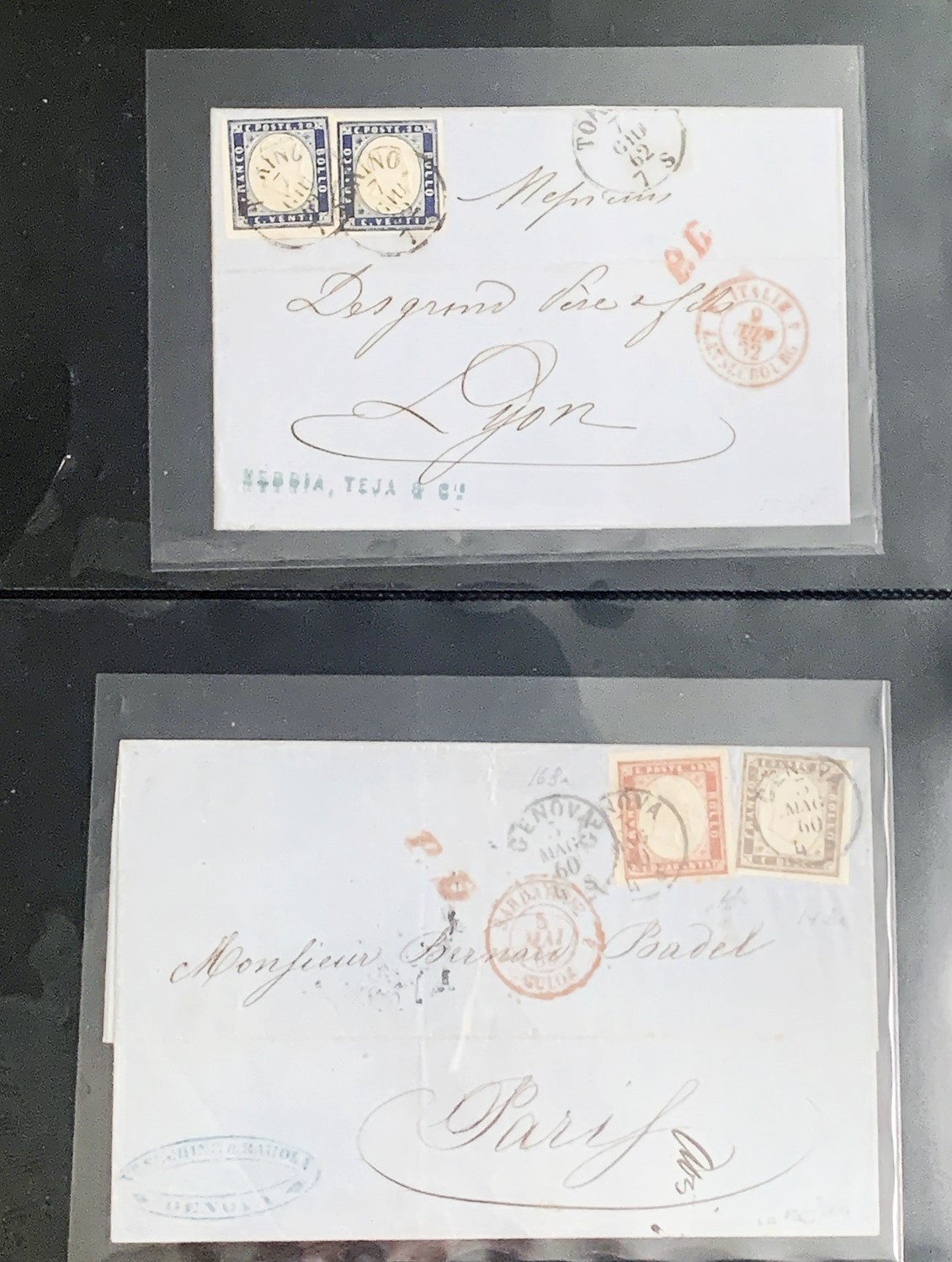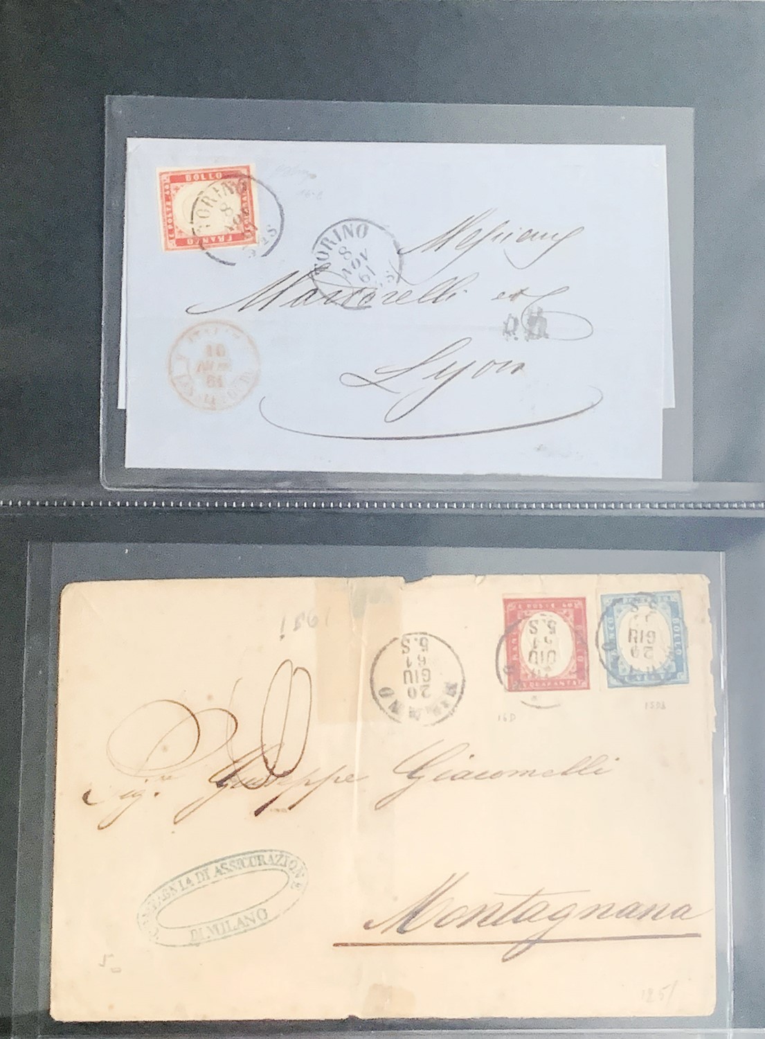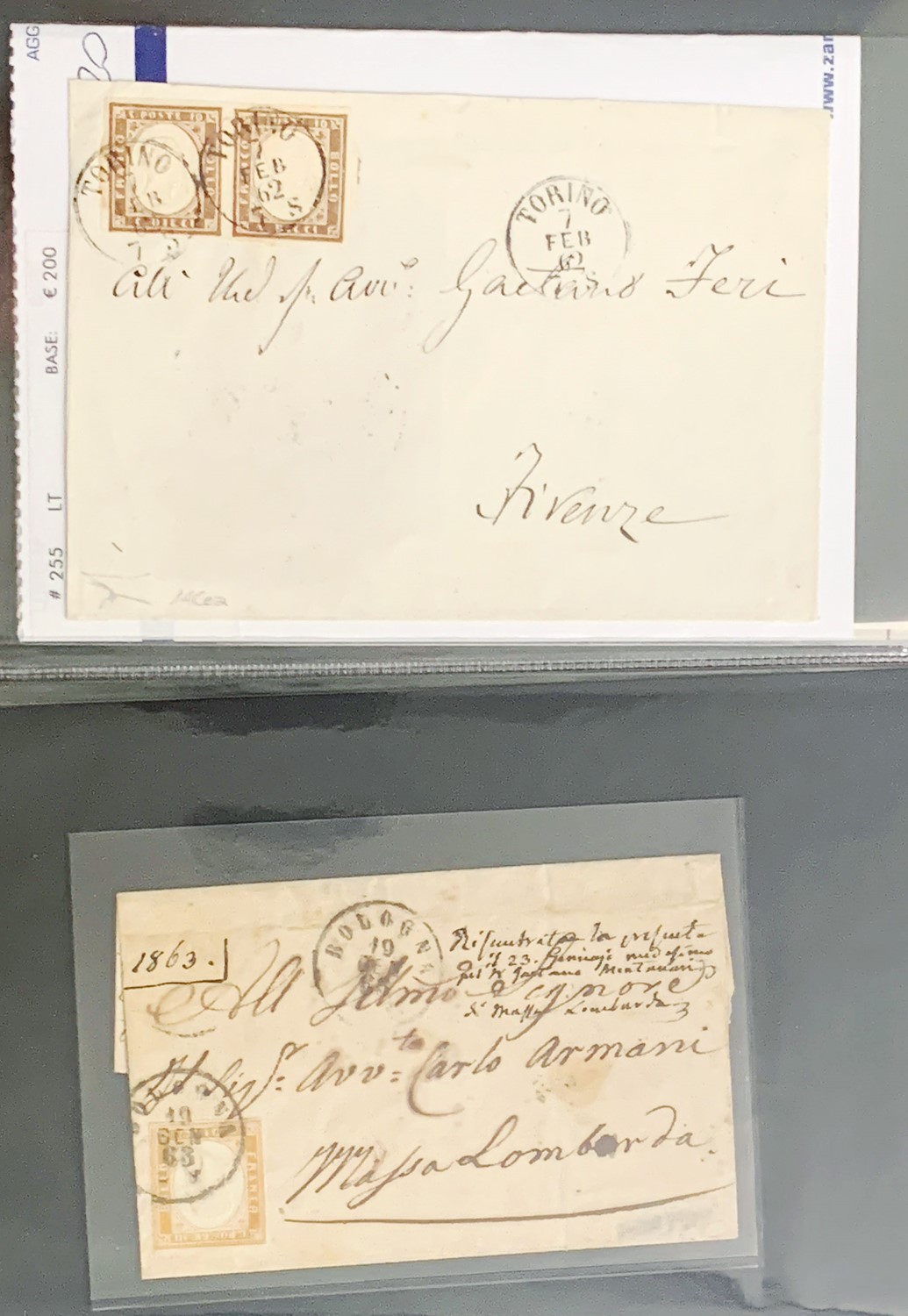1851/63 - SARDEGNA / REGNO D'ITALIA: insieme di 46 lettere, un frontespizio ed un frammento con interessanti affrancature, anche rare, di qualità mista, in genere ottima. Notate alcune tariffe di raggio limitrofo, una tariffa militare, qualche gradazione di colore pregiata, un 80 centesimi isolato per la Francia di ottima qualità e una lettera con affrancatura tricolore mista da 55 centesimi composta con Sardegna IV emissione e Regno "Matraire" dentellati. Insieme molto interessante corredato da 16 CF