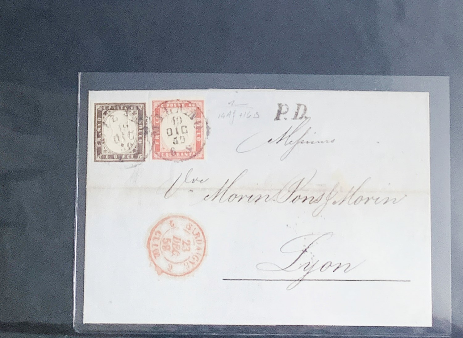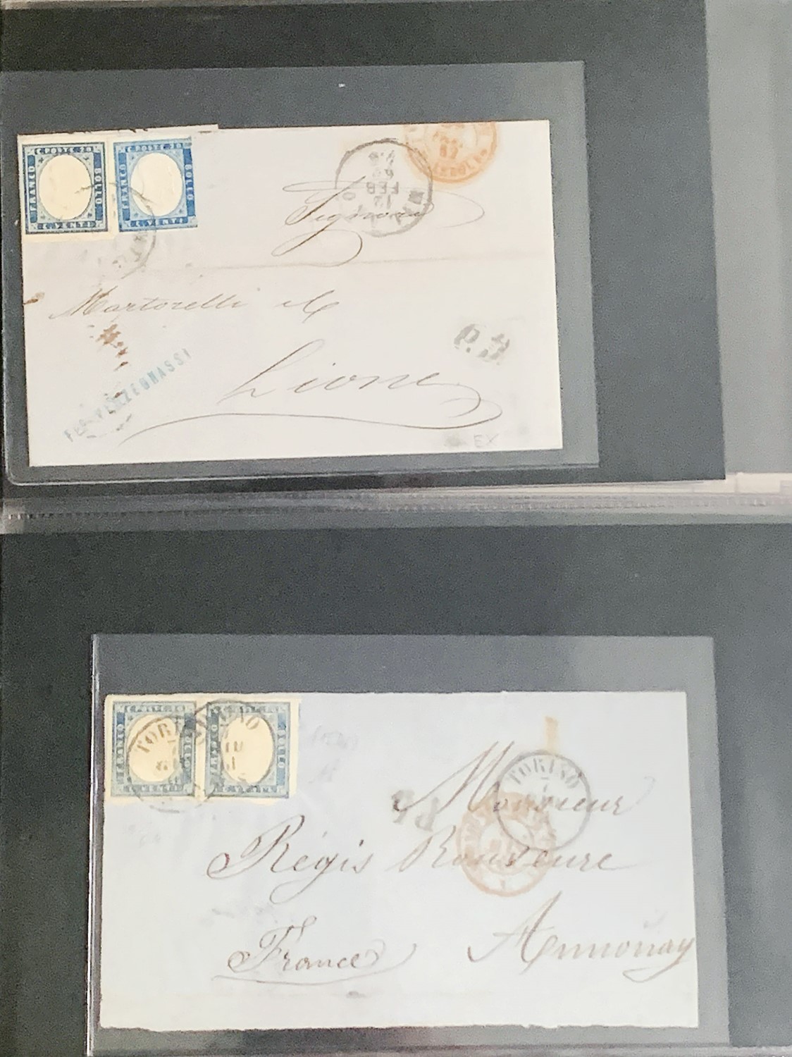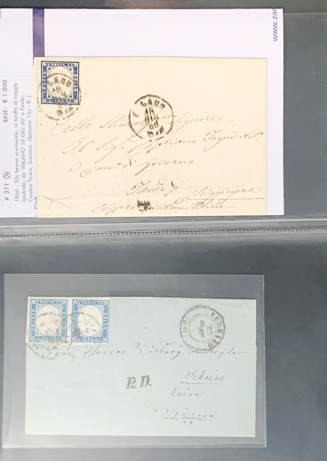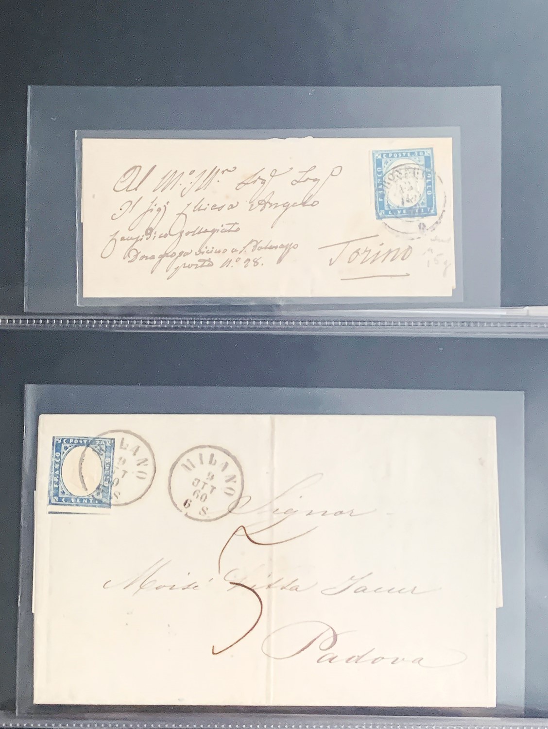 1851/63 - SARDEGNA / REGNO D'ITALIA: insieme di 46 lettere, un frontespizio ed un frammento con interessanti affrancature, anche rare, di qualità mista, in genere ottima. Notate alcune tariffe di raggio limitrofo, una tariffa militare, qualche gradazione di colore pregiata, un 80 centesimi isolato per la Francia di ottima qualità e una lettera con affrancatura tricolore mista da 55 centesimi composta con Sardegna IV emissione e Regno "Matraire" dentellati. Insieme molto interessante corredato da 16 CF