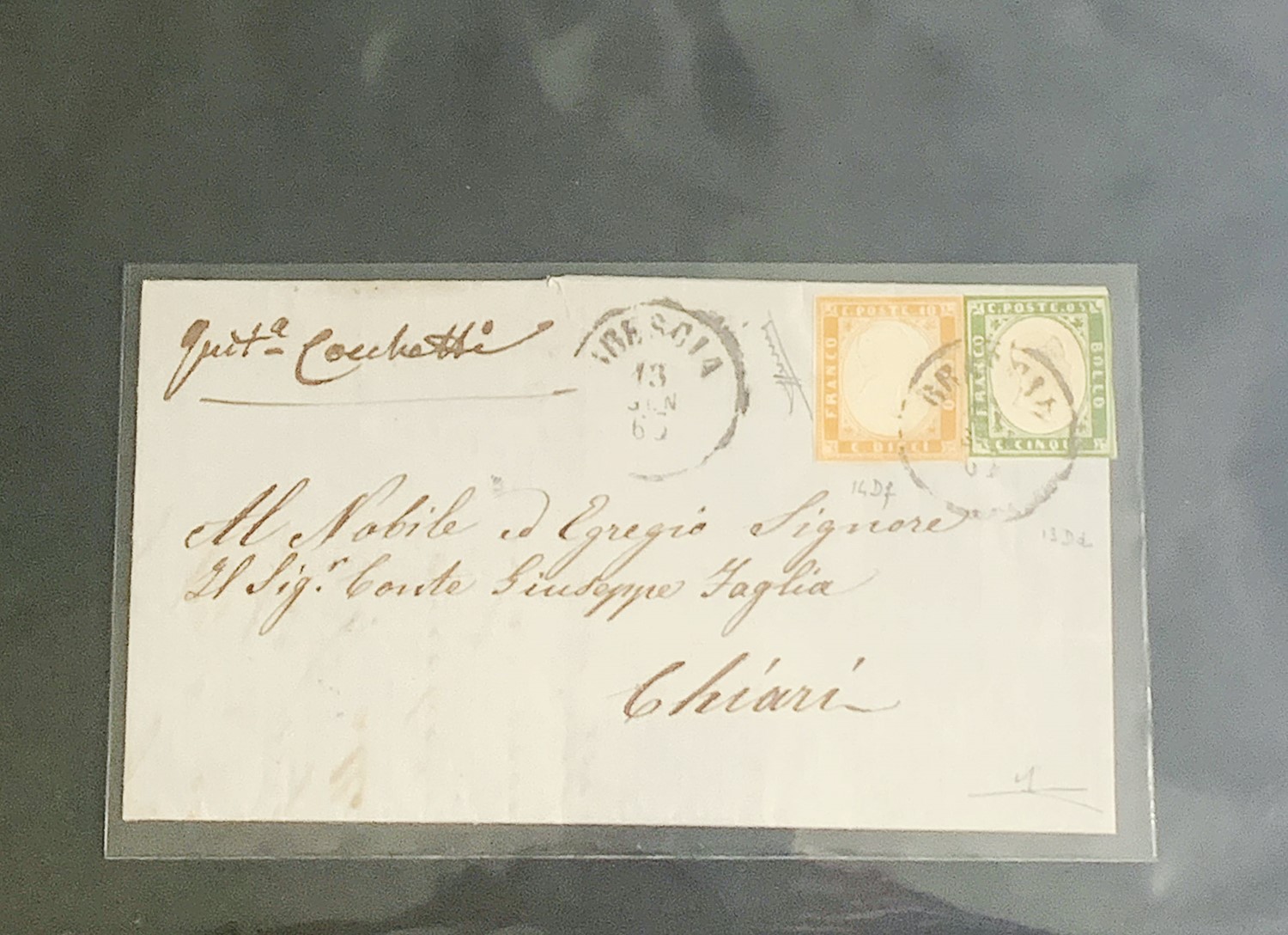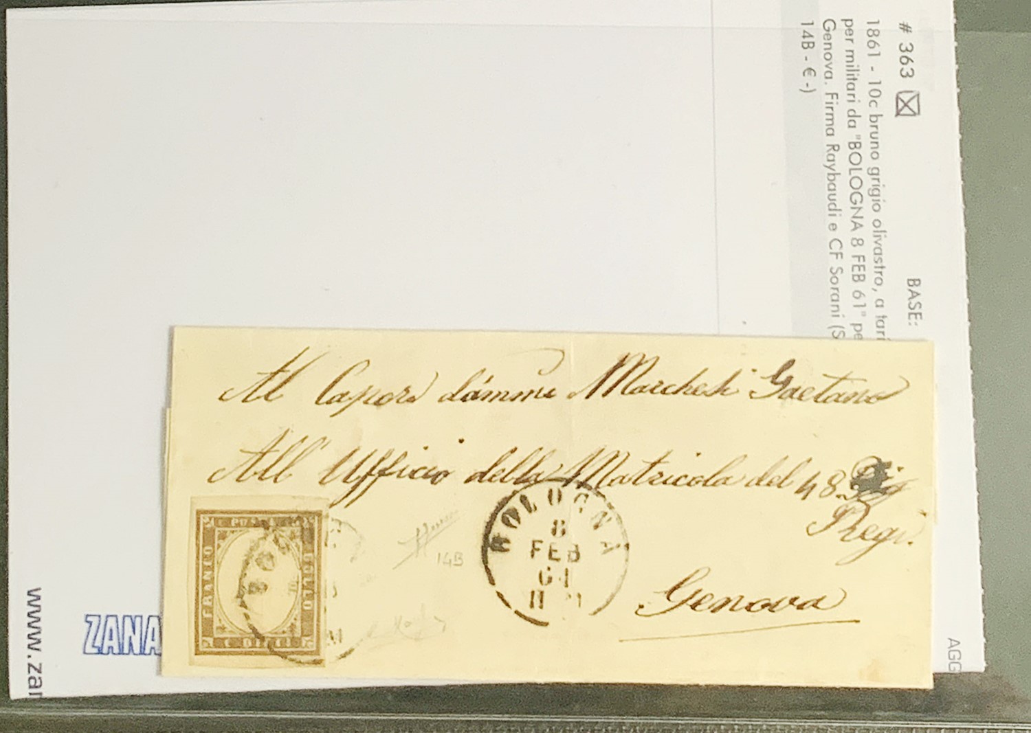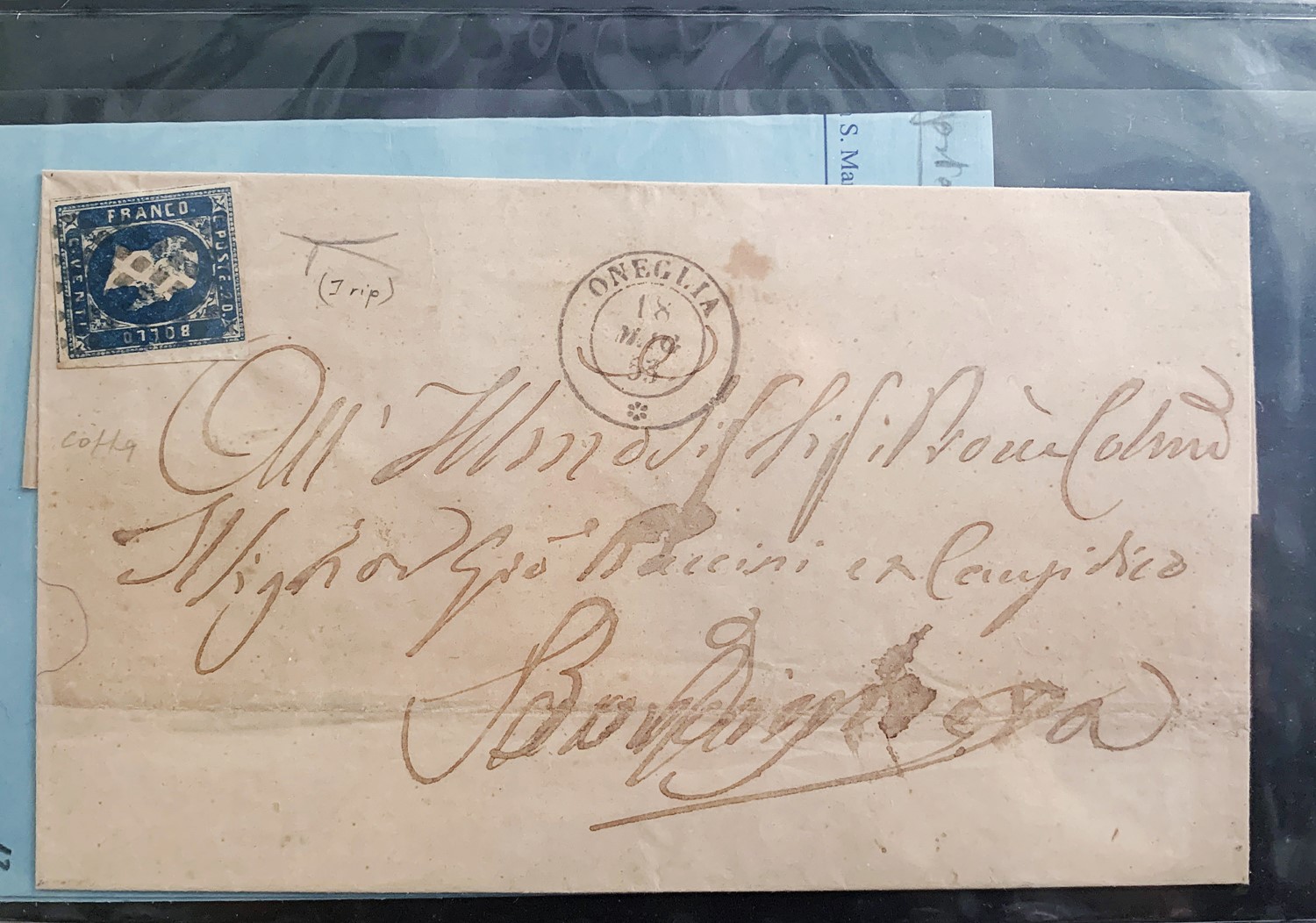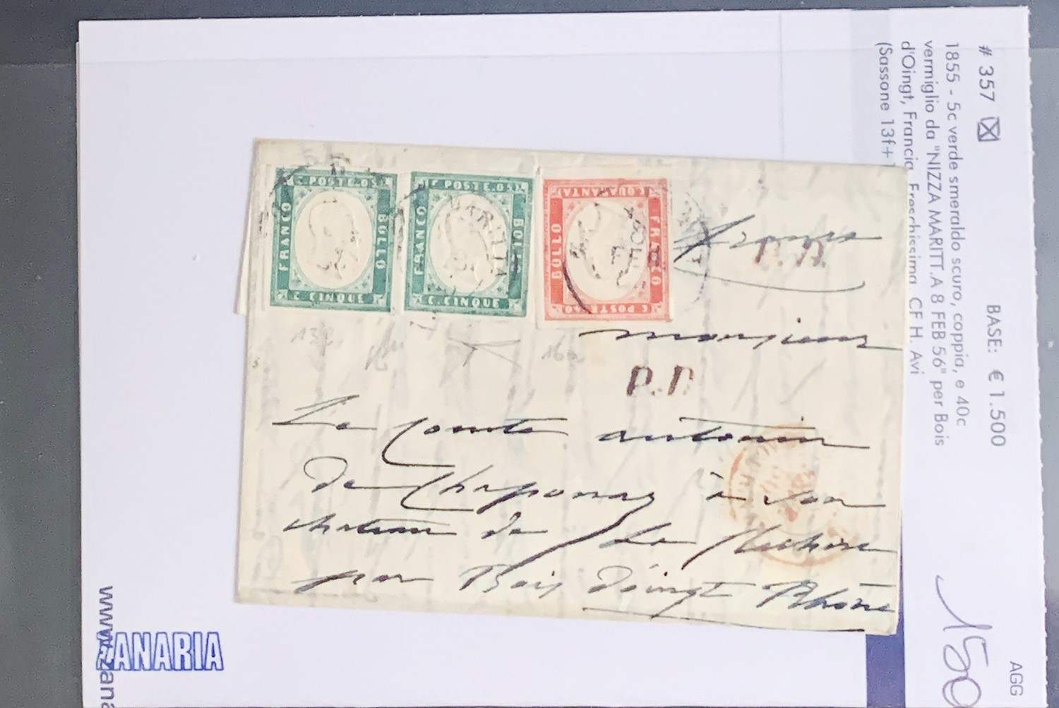 1851/63 - SARDEGNA / REGNO D'ITALIA: insieme di 46 lettere, un frontespizio ed un frammento con interessanti affrancature, anche rare, di qualità mista, in genere ottima. Notate alcune tariffe di raggio limitrofo, una tariffa militare, qualche gradazione di colore pregiata, un 80 centesimi isolato per la Francia di ottima qualità e una lettera con affrancatura tricolore mista da 55 centesimi composta con Sardegna IV emissione e Regno "Matraire" dentellati. Insieme molto interessante corredato da 16 CF