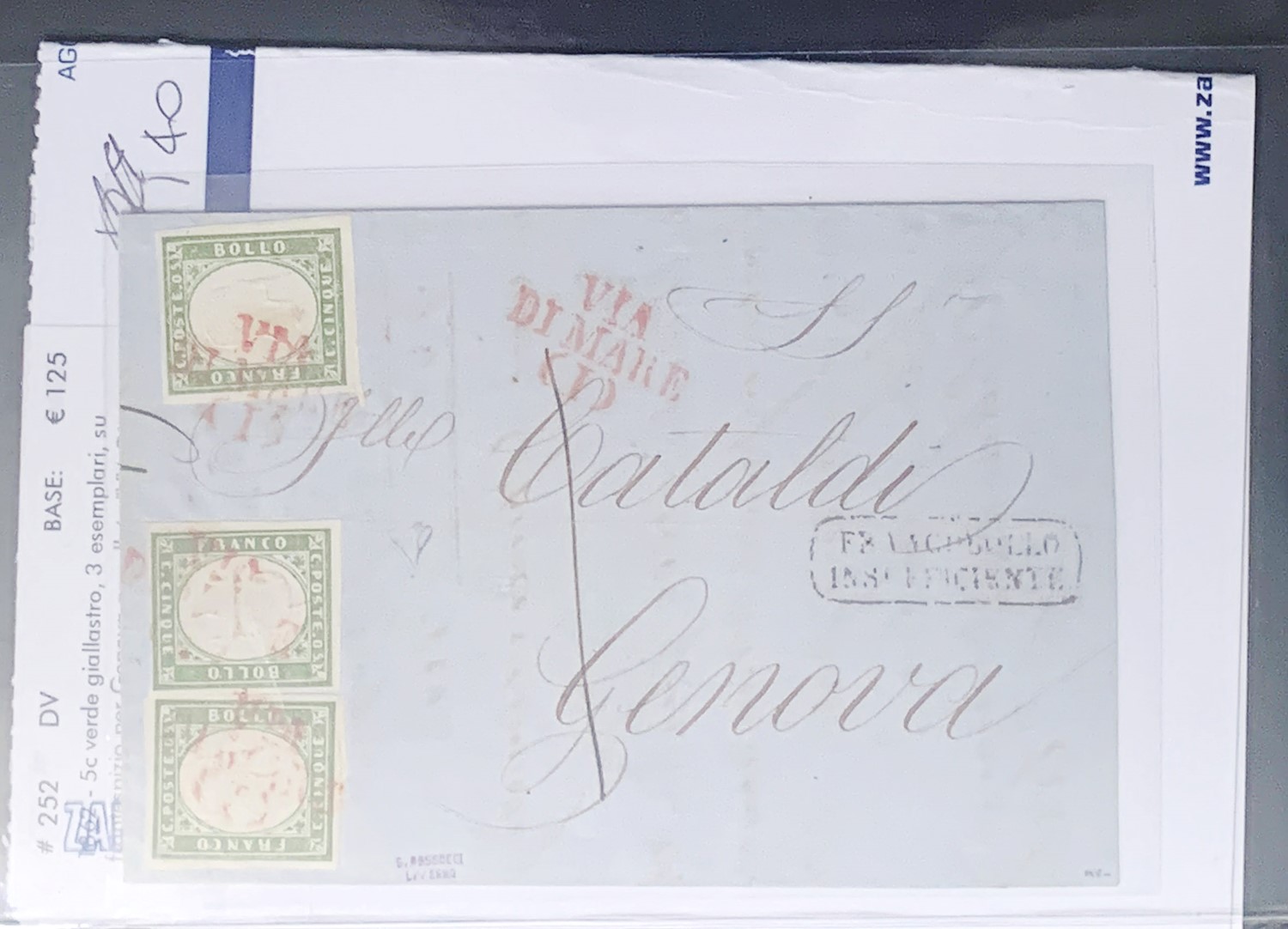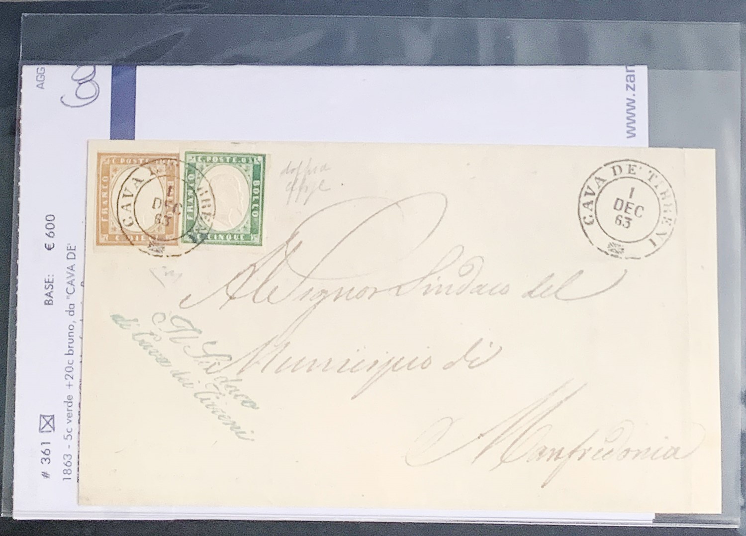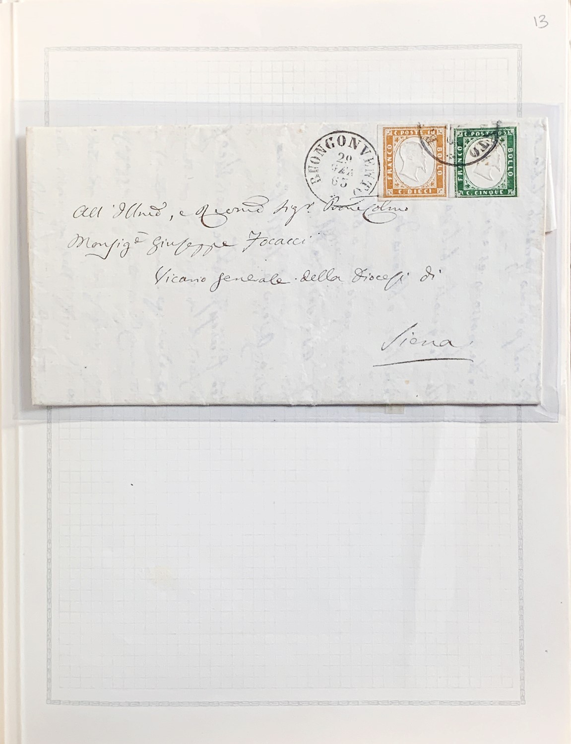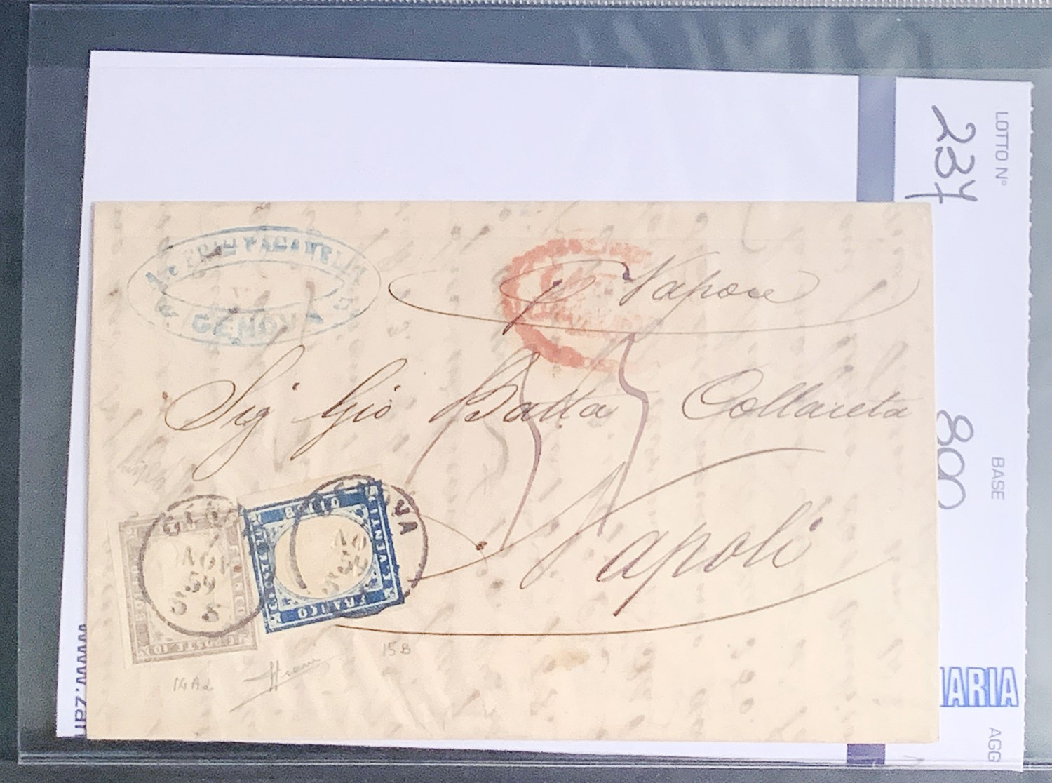 1851/63 - SARDEGNA / REGNO D'ITALIA: insieme di 46 lettere, un frontespizio ed un frammento con interessanti affrancature, anche rare, di qualità mista, in genere ottima. Notate alcune tariffe di raggio limitrofo, una tariffa militare, qualche gradazione di colore pregiata, un 80 centesimi isolato per la Francia di ottima qualità e una lettera con affrancatura tricolore mista da 55 centesimi composta con Sardegna IV emissione e Regno "Matraire" dentellati. Insieme molto interessante corredato da 16 CF