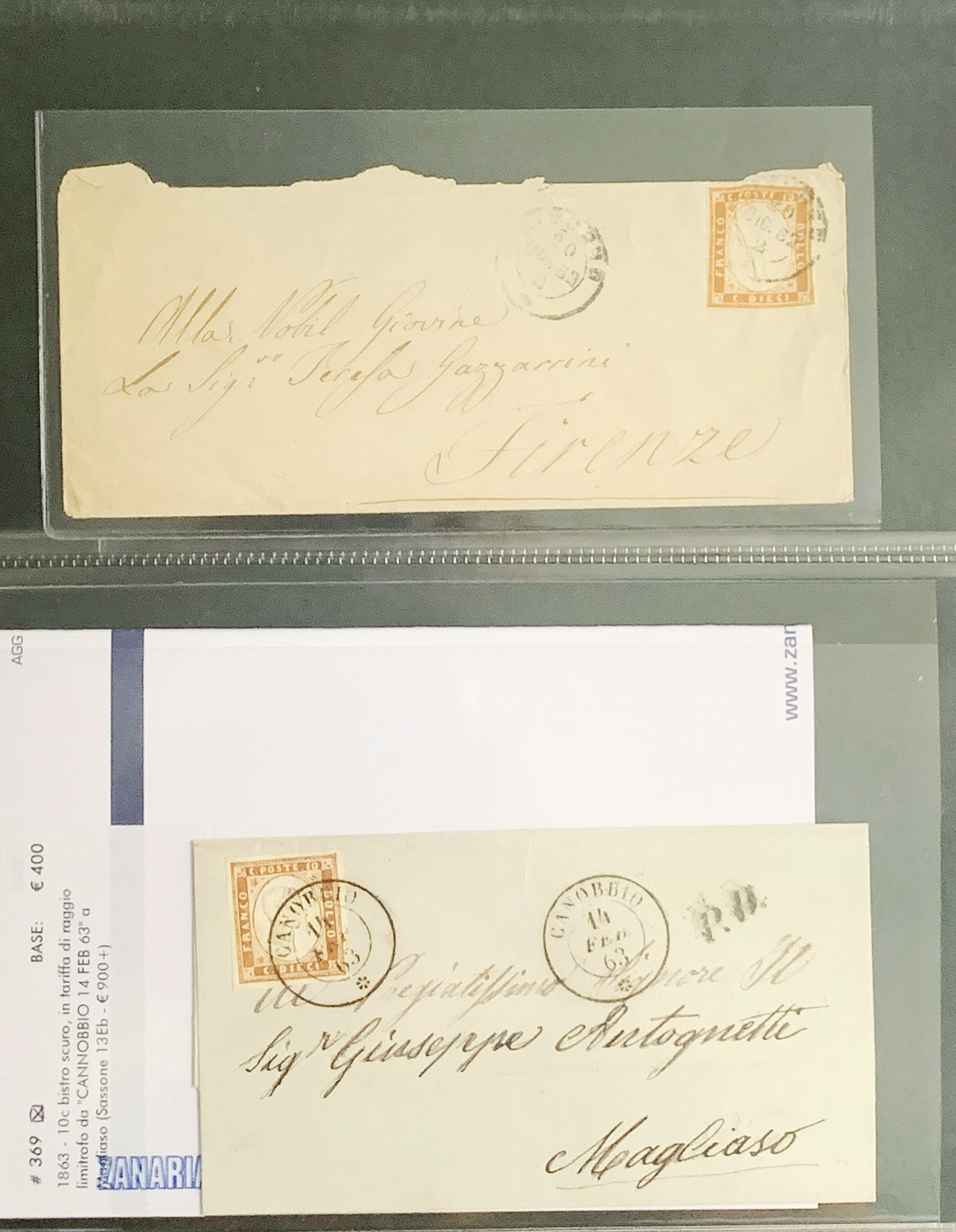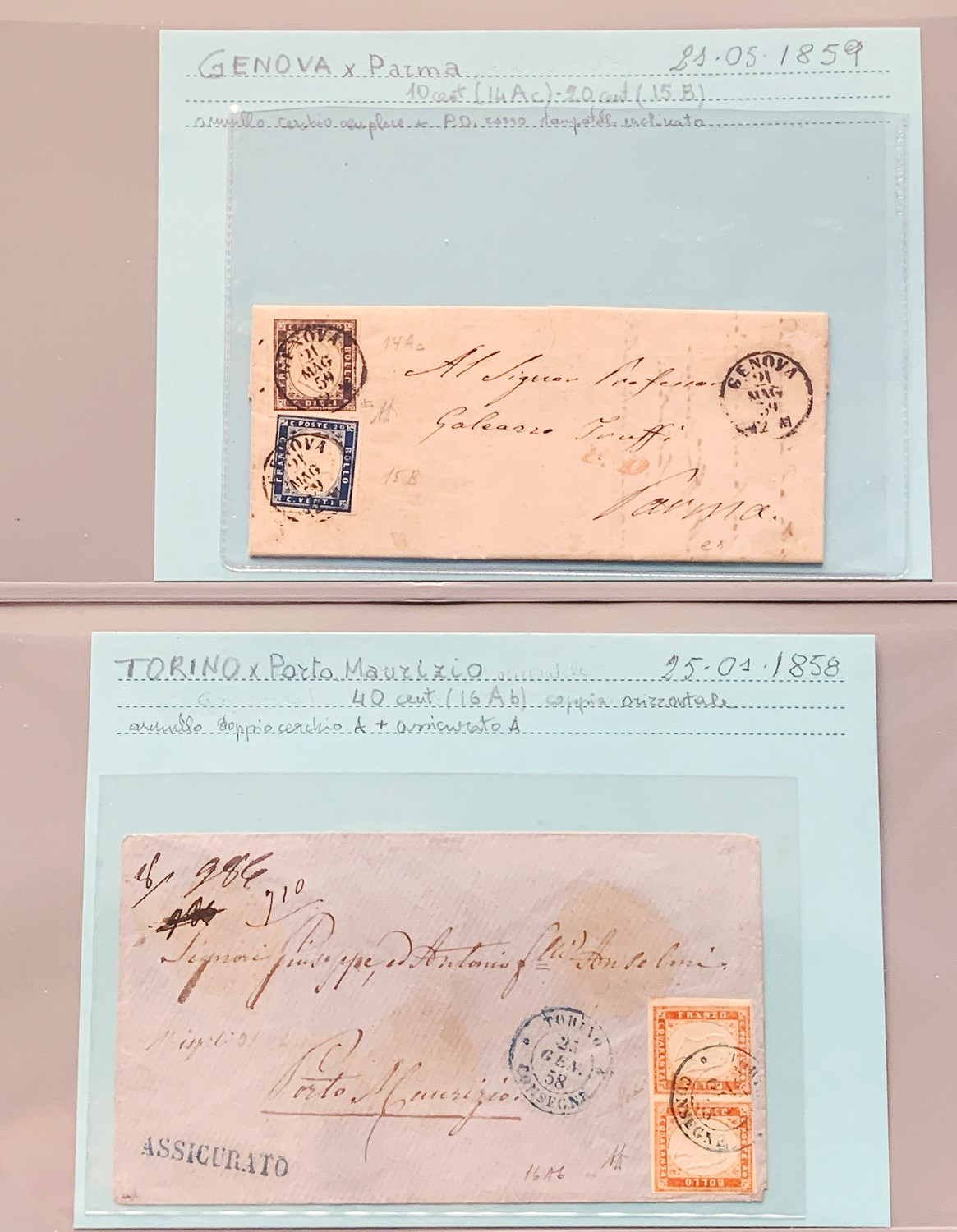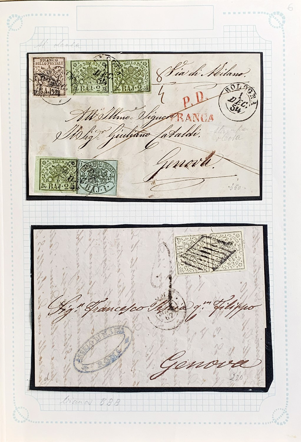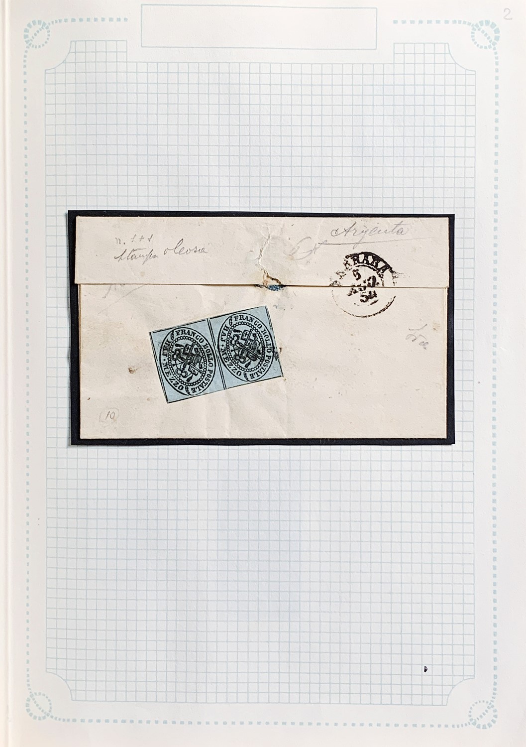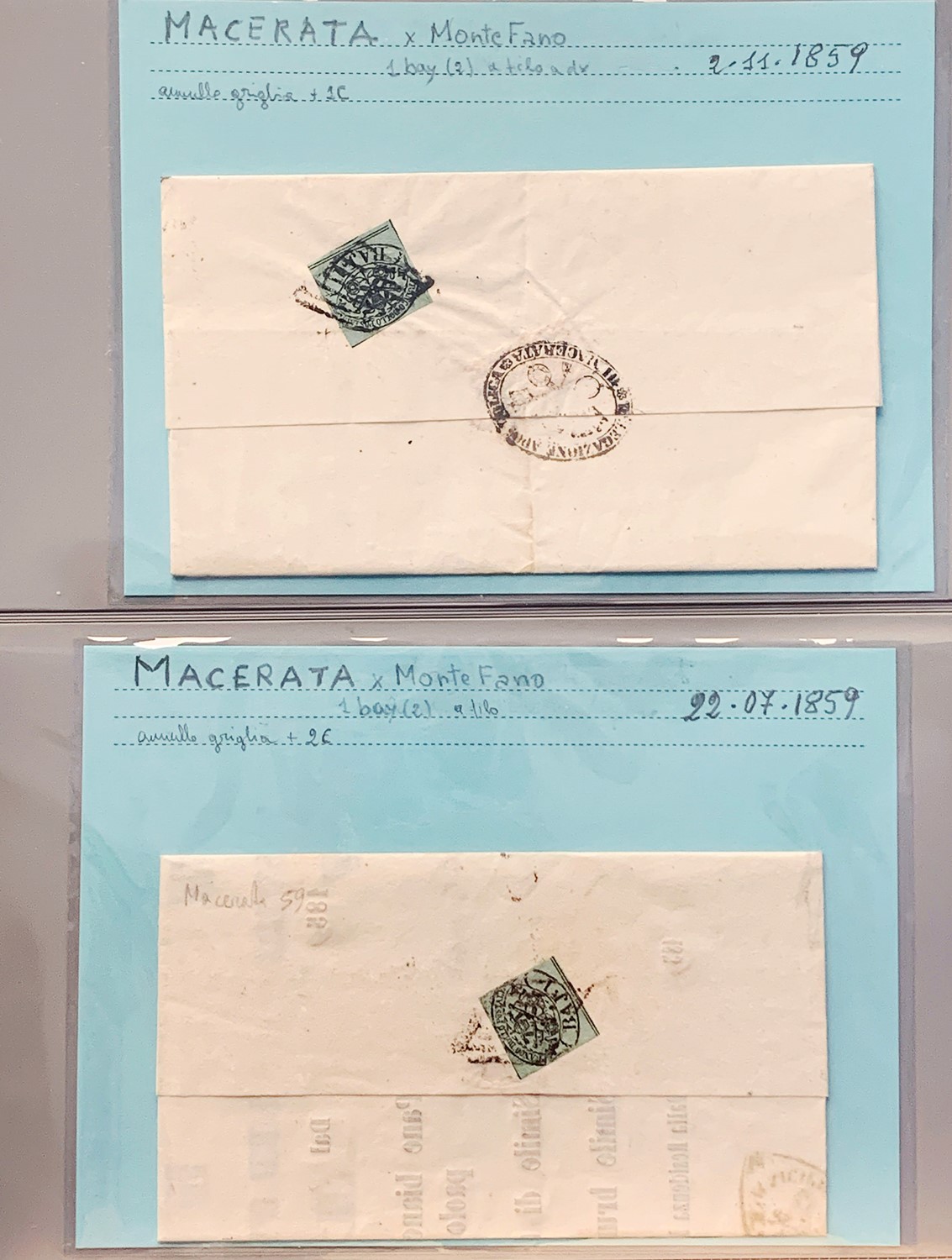 1852/63 - PONTIFICIO - ANNULLAMENTI DELLE MARCHE: eccezionale e importantissima collezione specializzata di oltre 200 lettere e alcuni frammenti di Pontificio / Sardegna / Regno con annullamenti delle Marche. Presenti molte importanti affrancature (strisce, blocchi e multipli) e annullamenti rari, in alcuni casi unici, spesso di punteggio R1, R2 e anche R3. Qualità generalmente ottima, con 61 CF, il tutto raccolto in 4 volumi. Nel lotto inclusi (ma non conteggiati) anche ulteriori 4 volumi contenenti oltre 300 lettere di Pontificio / Sardegna / Regno con annullamenti delle Marche di punteggio inferiore ai 7pt. Importante e irripetibile insieme tanto per lo specialista quanto per il professionista. Occasione unica (Come per tutti i lotti e collezioni in asta, si invitano i clienti interessati a esaminare attentamente il lotto in modo da poter effettuare le proprie valutazioni personali prima di fare offerte. Ricordiamo che non vengono accettati reclami per i lotti composti da cinque elementi o piu')