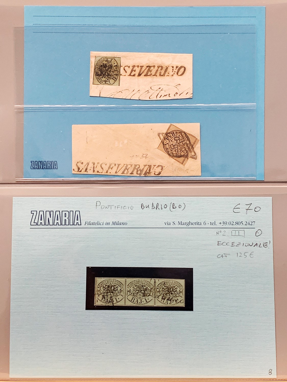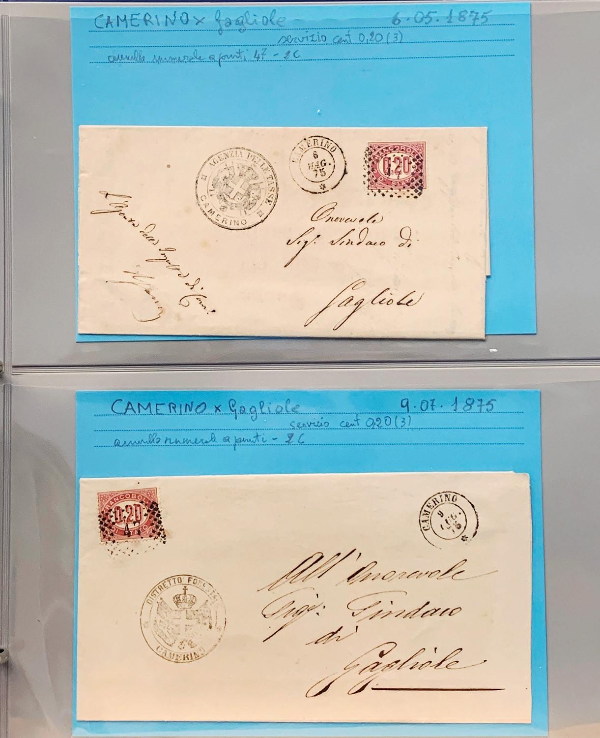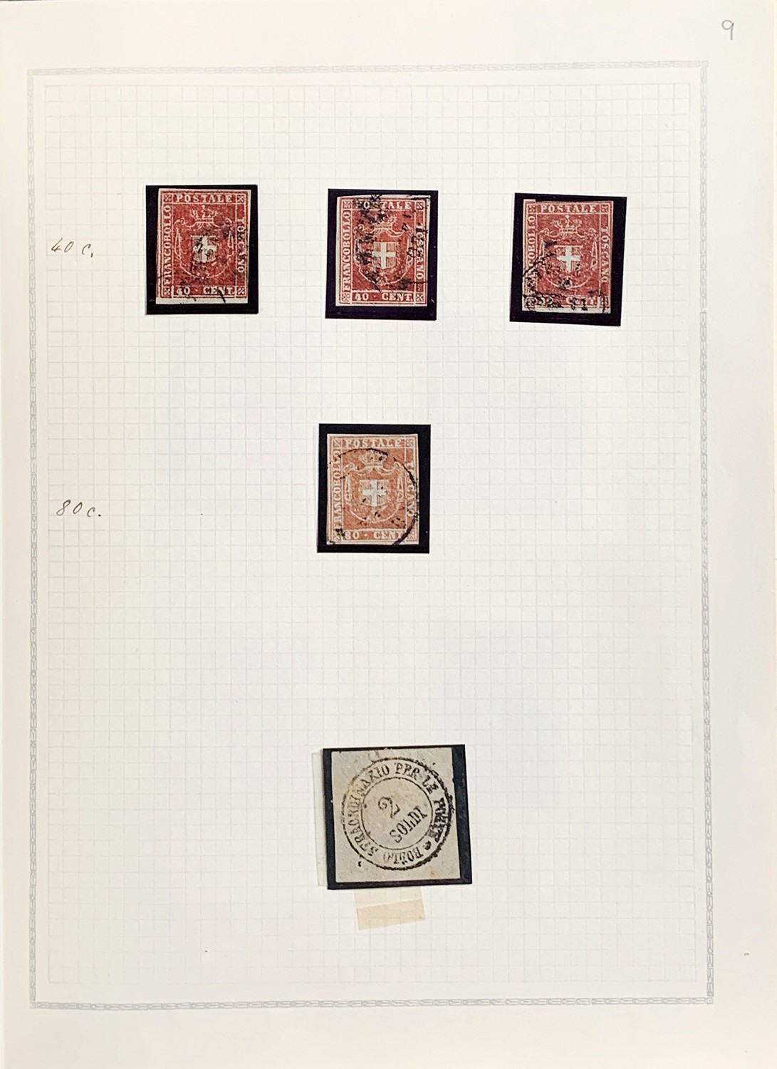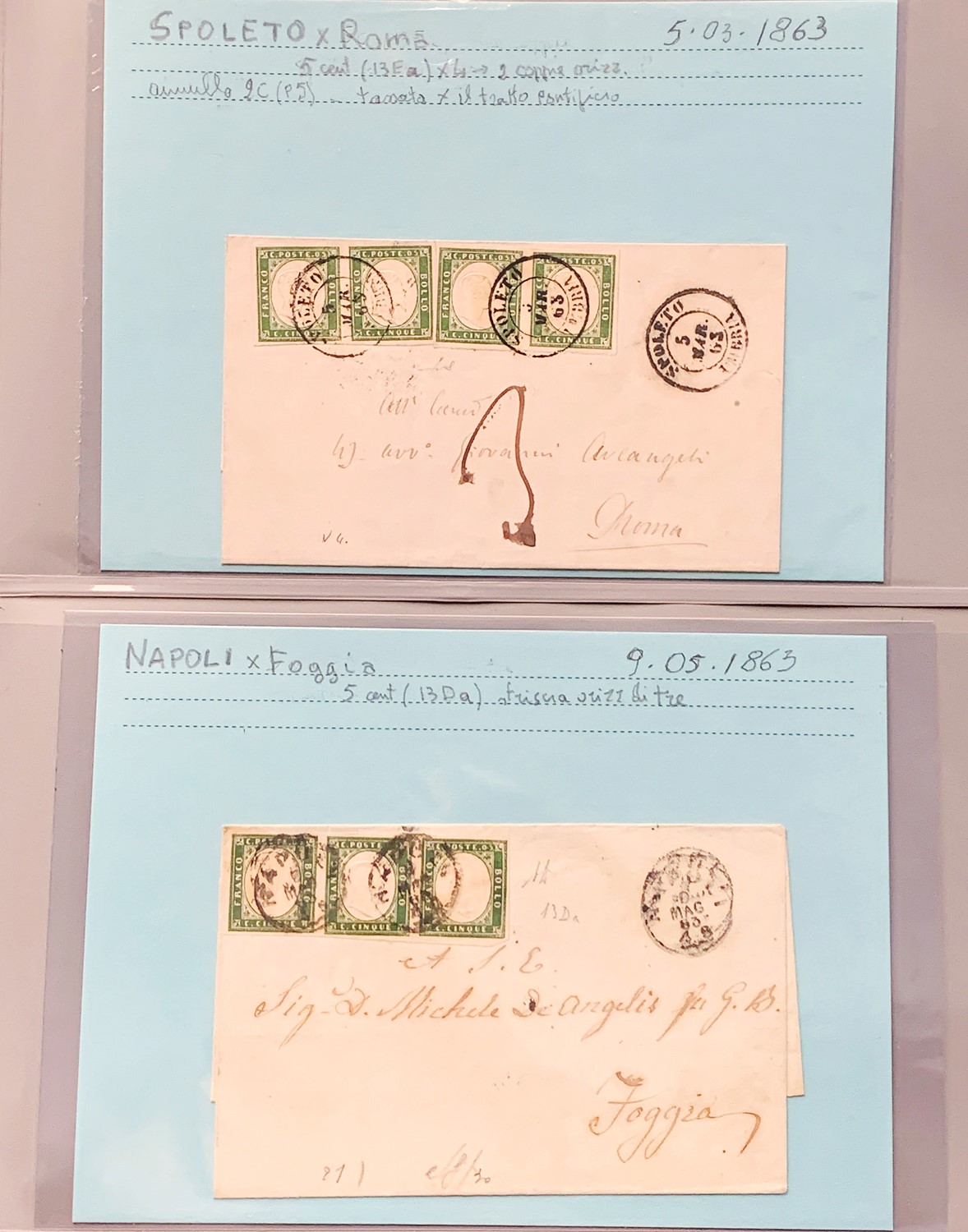 1852/63 - PONTIFICIO - ANNULLAMENTI DELLE MARCHE: eccezionale e importantissima collezione specializzata di oltre 200 lettere e alcuni frammenti di Pontificio / Sardegna / Regno con annullamenti delle Marche. Presenti molte importanti affrancature (strisce, blocchi e multipli) e annullamenti rari, in alcuni casi unici, spesso di punteggio R1, R2 e anche R3. Qualità generalmente ottima, con 61 CF, il tutto raccolto in 4 volumi. Nel lotto inclusi (ma non conteggiati) anche ulteriori 4 volumi contenenti oltre 300 lettere di Pontificio / Sardegna / Regno con annullamenti delle Marche di punteggio inferiore ai 7pt. Importante e irripetibile insieme tanto per lo specialista quanto per il professionista. Occasione unica (Come per tutti i lotti e collezioni in asta, si invitano i clienti interessati a esaminare attentamente il lotto in modo da poter effettuare le proprie valutazioni personali prima di fare offerte. Ricordiamo che non vengono accettati reclami per i lotti composti da cinque elementi o piu')