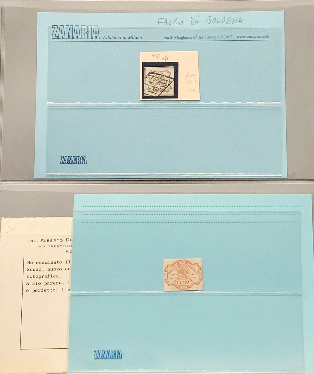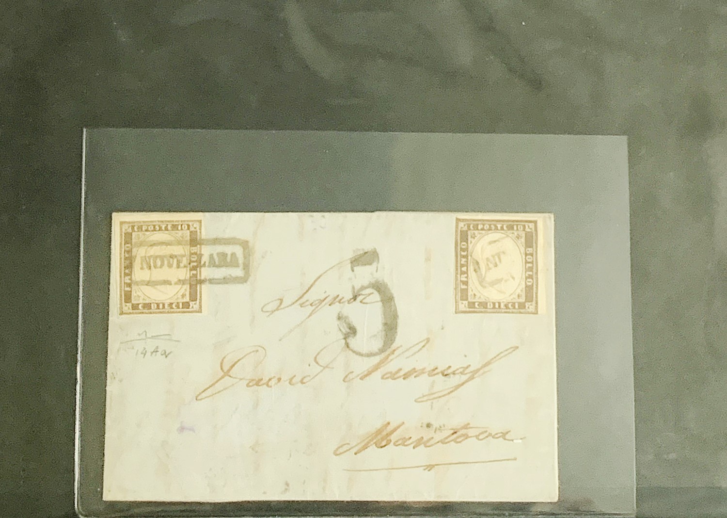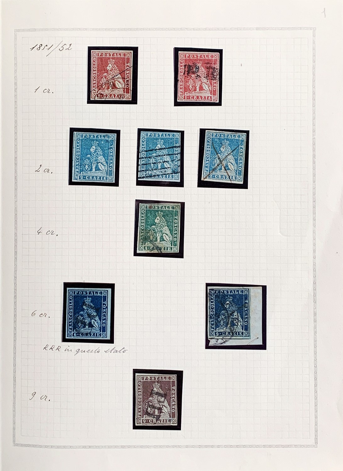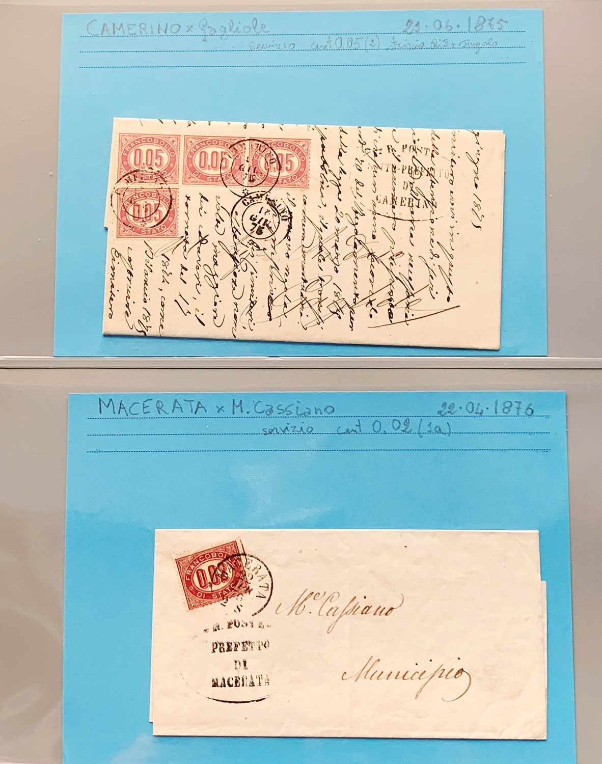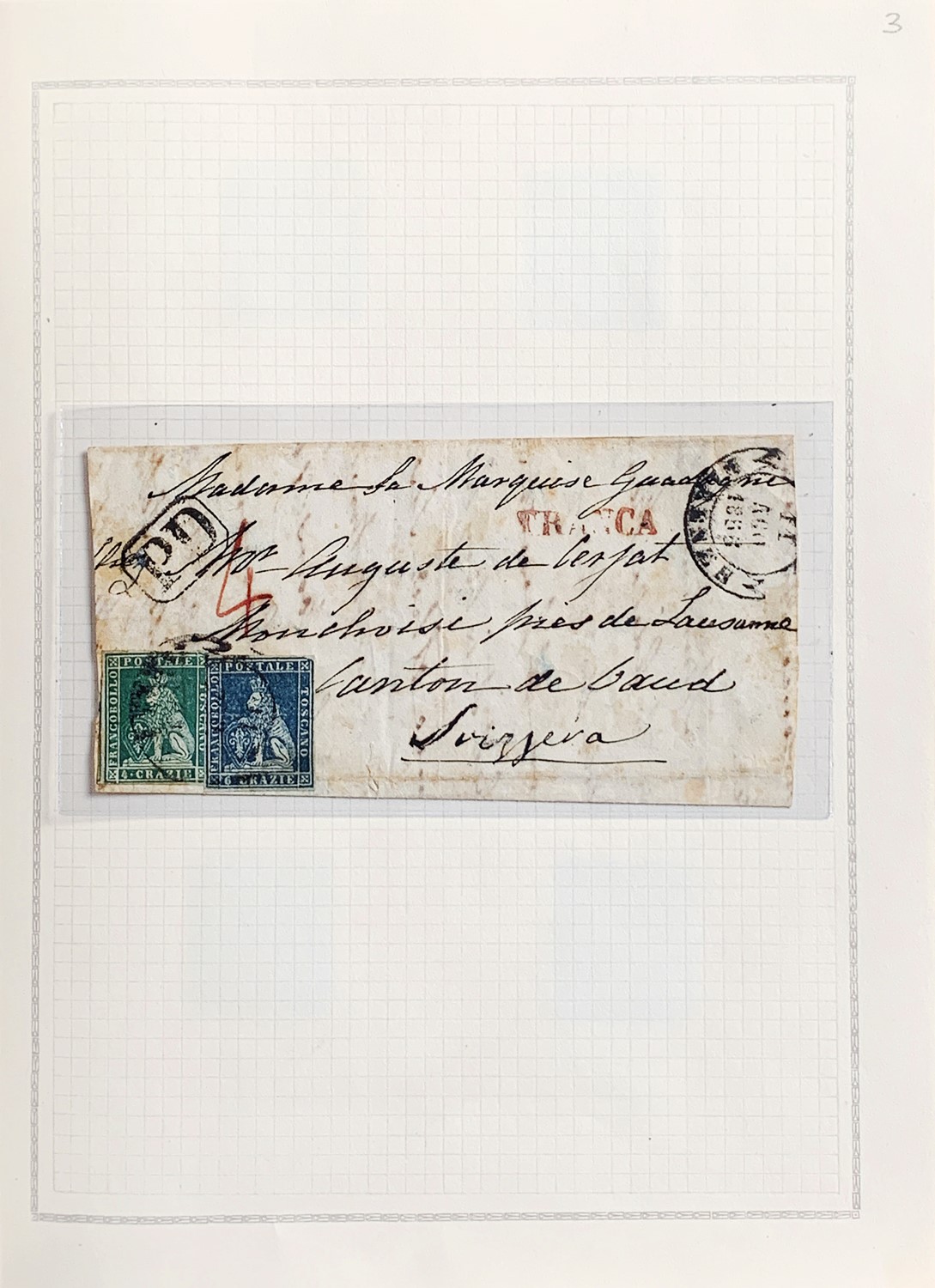 1852/63 - PONTIFICIO - ANNULLAMENTI DELLE MARCHE: eccezionale e importantissima collezione specializzata di oltre 200 lettere e alcuni frammenti di Pontificio / Sardegna / Regno con annullamenti delle Marche. Presenti molte importanti affrancature (strisce, blocchi e multipli) e annullamenti rari, in alcuni casi unici, spesso di punteggio R1, R2 e anche R3. Qualità generalmente ottima, con 61 CF, il tutto raccolto in 4 volumi. Nel lotto inclusi (ma non conteggiati) anche ulteriori 4 volumi contenenti oltre 300 lettere di Pontificio / Sardegna / Regno con annullamenti delle Marche di punteggio inferiore ai 7pt. Importante e irripetibile insieme tanto per lo specialista quanto per il professionista. Occasione unica (Come per tutti i lotti e collezioni in asta, si invitano i clienti interessati a esaminare attentamente il lotto in modo da poter effettuare le proprie valutazioni personali prima di fare offerte. Ricordiamo che non vengono accettati reclami per i lotti composti da cinque elementi o piu')