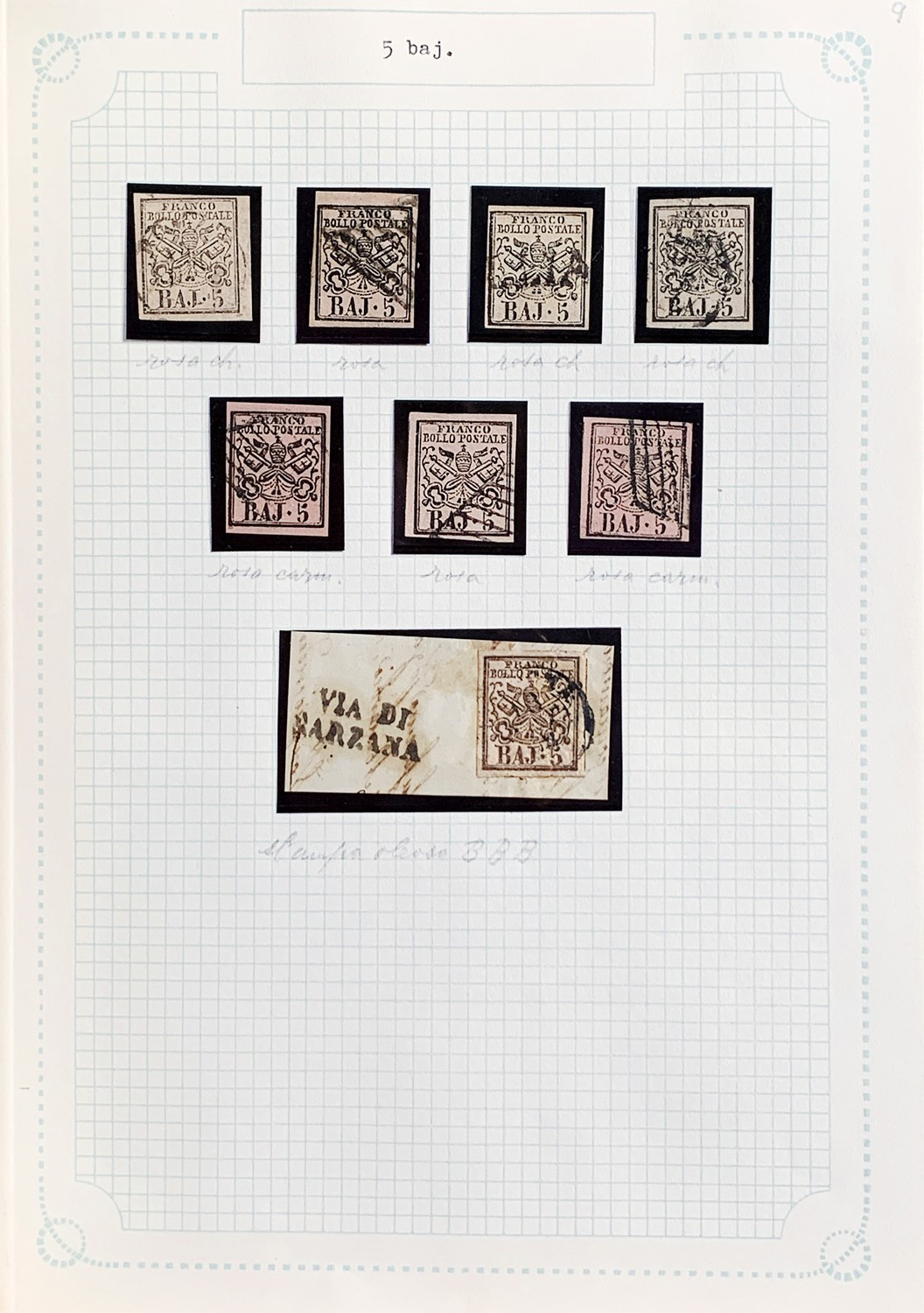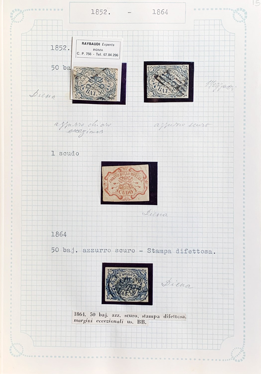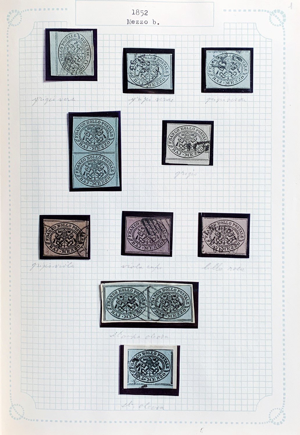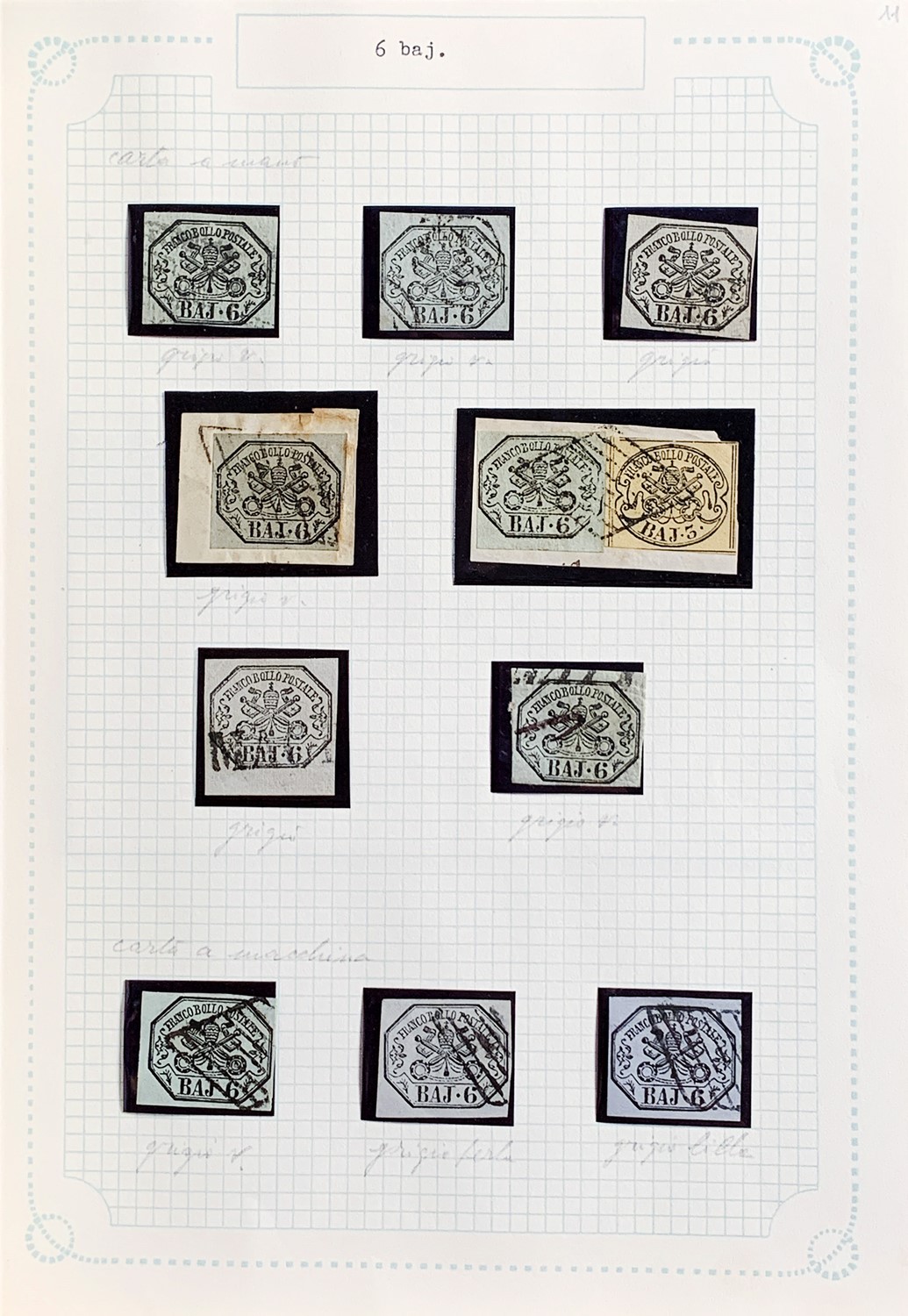 1852 - PONTIFICIO: piccola collezione della I emissione, composta da francobolli nuovi, usati e su frammento. Sono presenti diversi pezzi di sicuro interesse tra cui una fascetta affrancata con 1/2baj e 1 scudo nuovo con gomma, perfetto. Insieme molto interessante e di ottima qualità generale. 4CF (Come per tutti i lotti e collezioni in asta, si invitano i clienti interessati a esaminare attentamente il lotto in modo da poter effettuare le proprie valutazioni personali prima di fare offerte. Ricordiamo che non vengono accettati reclami per i lotti composti da cinque elementi o piu')