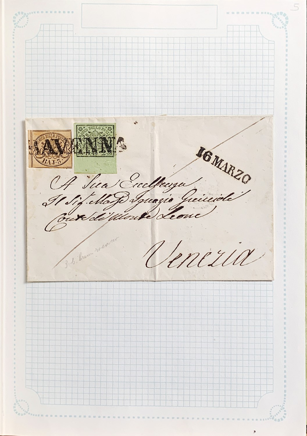 1852 - 1baj green blue at the back of letter from "TALAMELLO" (SD) to Rimini. Rare cancel, very well struck. Cert. Manzoni and Zanaria (Sassone 2a+pt.R1 - Euro - 16.500) (Image 1)(Image 2)(Image 3)(Image 4)