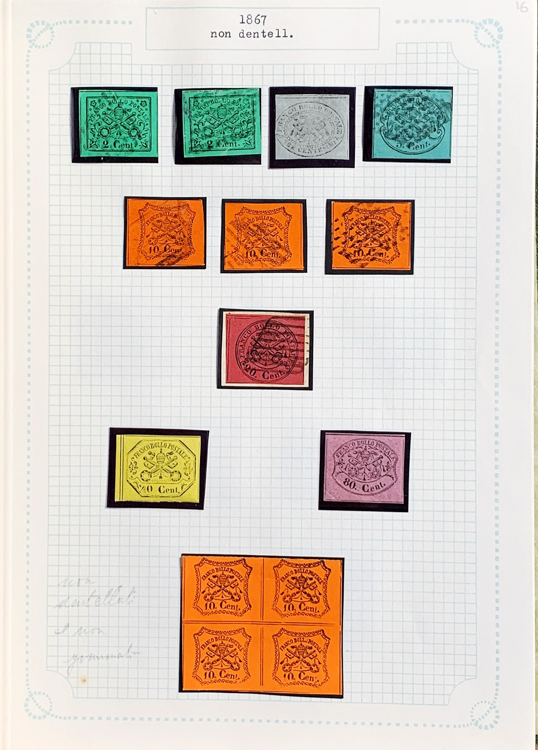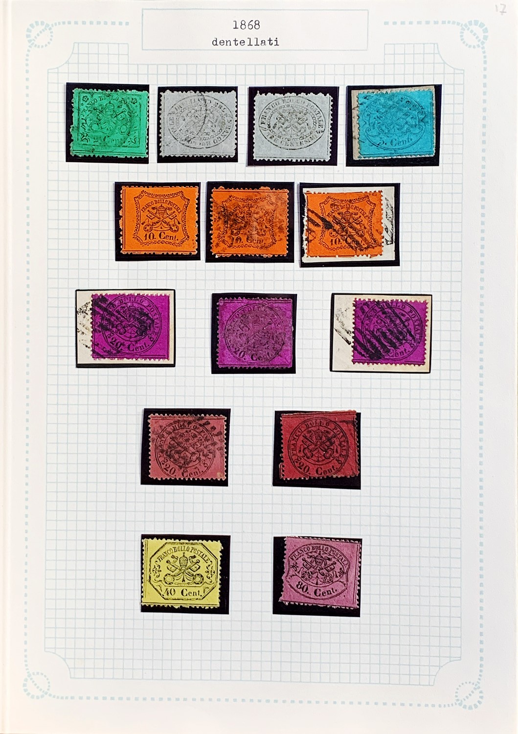 1852/68 - PONTIFICIO: collezione delle tre emissioni composta da francobolli nuovi, usati, su frammento e su lettera, raccolti in un album, con diverse interessanti presenze. Notati gli alti valori della prima emissione con leggeri difetti, ma di ottima presenza. Alto valore di catalogo, occasione (Come per tutti i lotti e collezioni in asta, si invitano i clienti interessati a esaminare attentamente il lotto in modo da poter effettuare le proprie valutazioni personali prima di fare offerte. Ricordiamo che non vengono accettati reclami per i lotti composti da cinque elementi o piu')