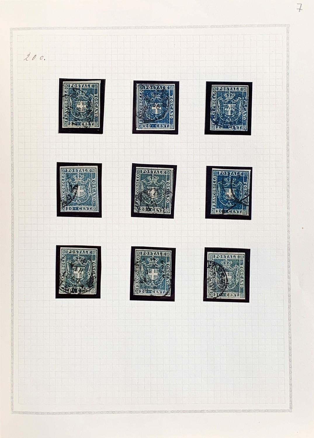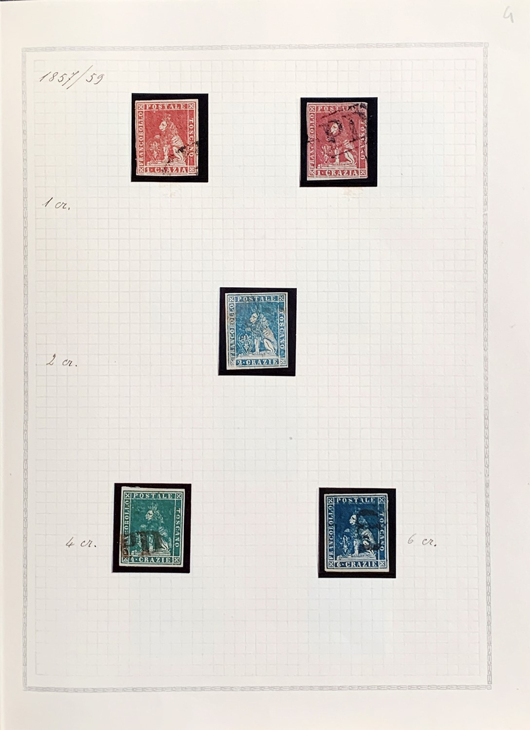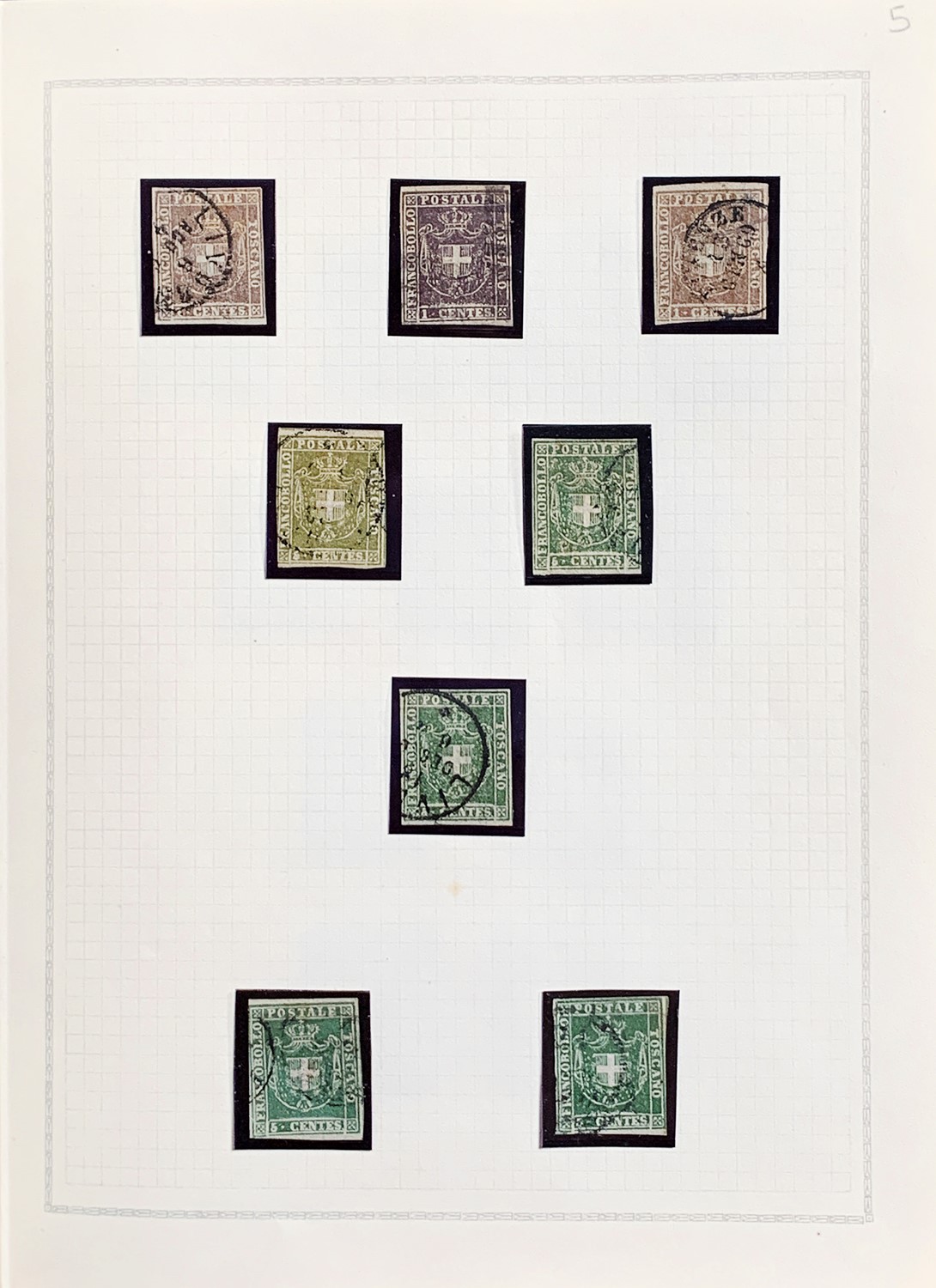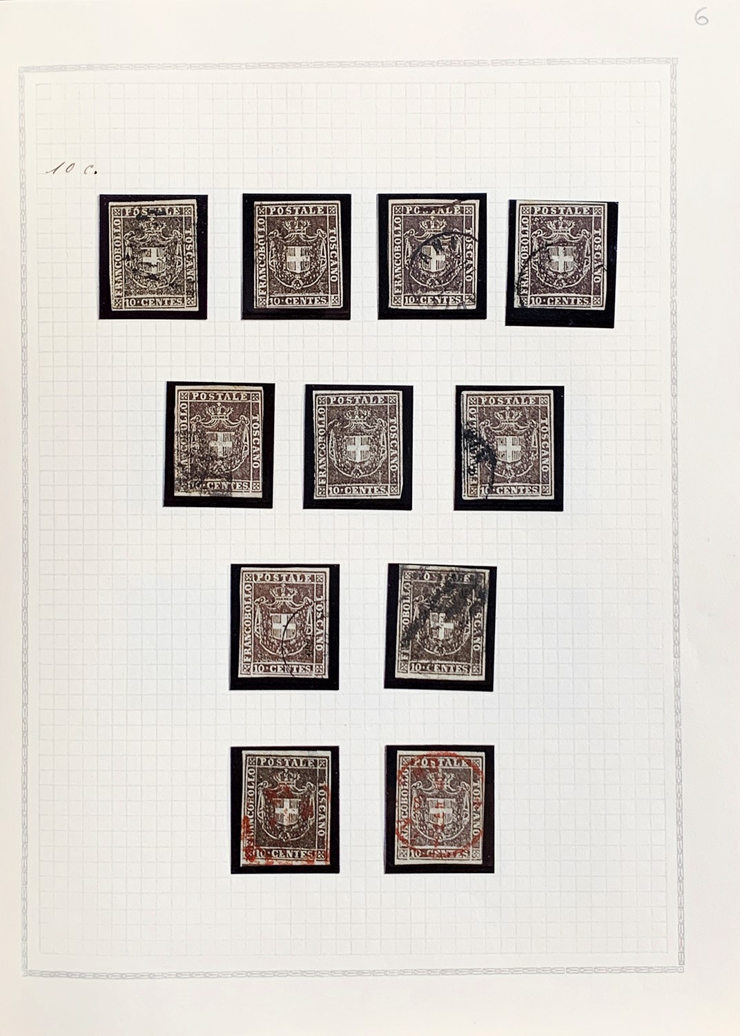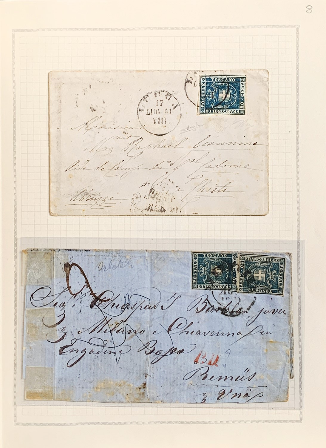 1851-1860 - TOSCANA: collezione delle emissioni del periodo composta da francobolli usati, su frammento e su lettera. Diverse interessanti presenze, insieme di qualità mista raccolto in un album